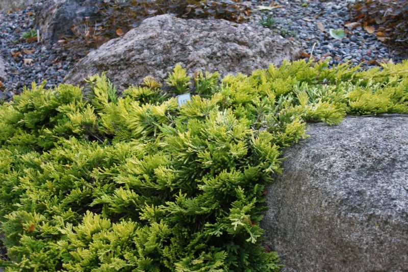 Morfoloģija. Dzinumi plati, tuvu zemei, zeltaini dzelteni. Skujas mīksti, īsi, dzelteni.