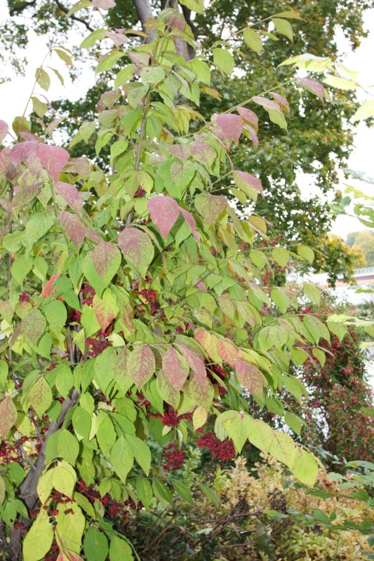 Morfoloģija. Dzinumi pelēcīgi brūni, cilindriski. Lapas eliptiskas līdz otrādi olveida, 3-12 cm garas un 2-8 cm platas, ar apaļu pamata, ar apaļu līdz smailu galu, smalki robainu malu, tumši zaļas. Kāts līdz 1,2 cm garš. Lapas kļūst karmīnsarkanas līdz dzeltenas rudenī. Zied ar 3-15 dzeltenzaļiem ziediem uz gariem kātiem. Zied maijā - jūnijā. Augļi ir sfēriskas pogaļas, līdz 1,5 cm platas, karmīnsarkanas. Sēklas sarkanas.