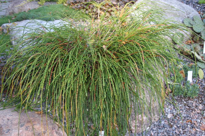 Morfoloģija. Dzinumi tievi, šķiedraini, nezaroti. No attāluma izskatās, ka krūms apvīts ar virvēm. Skujas tumši zaļas.
