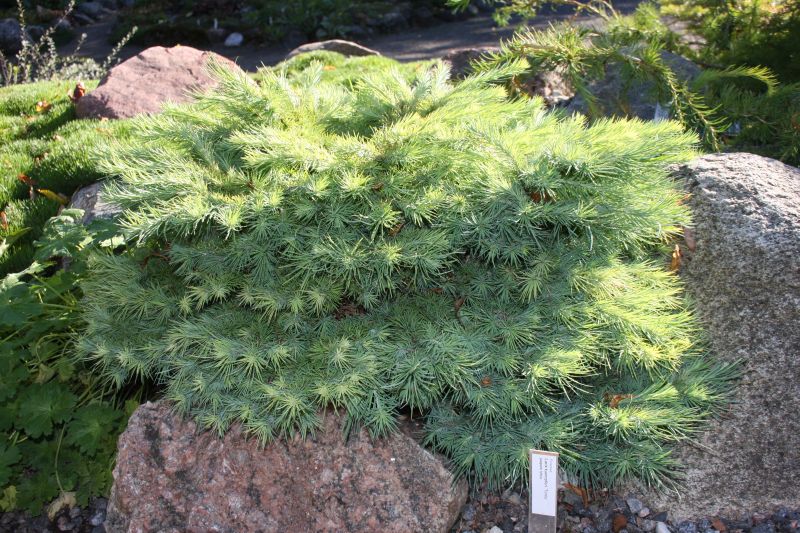 Morfoloģija. Zari izstiepti, nezaroti. Skujas zilgani zaļas, dzeltenas rudenī, 2-3 cm garas, blīvi sakārtotas uz dzinumiem.