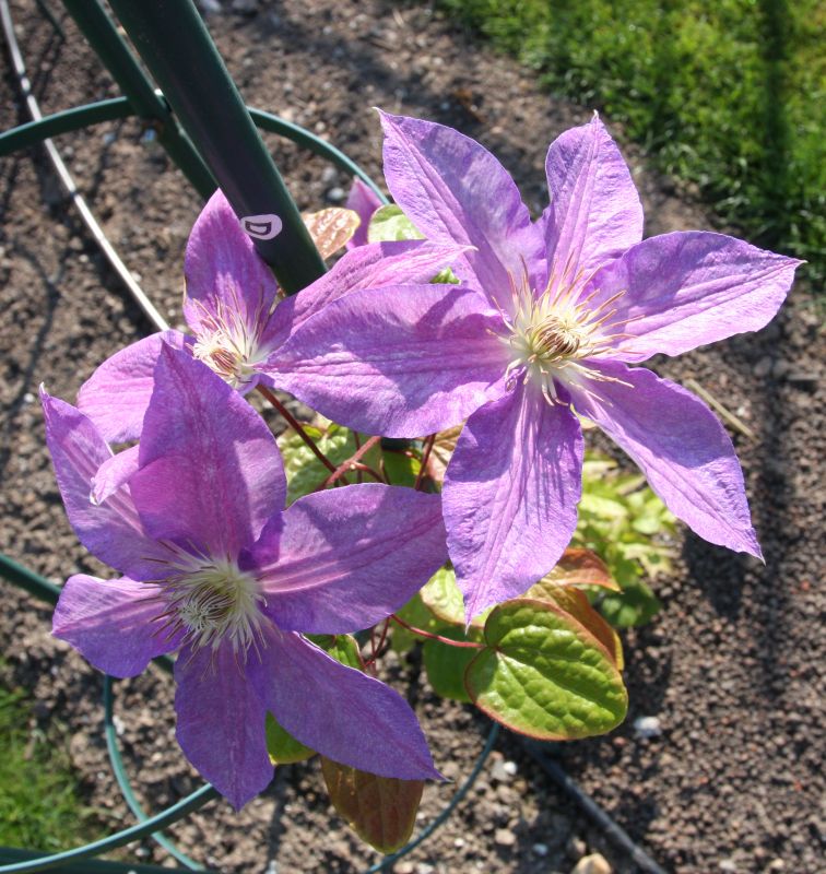 Morfoloģija. Lapas trīsdaivaini saliktas, var parādīties arī veselas lapas. Ziedi gaiši violeti, zili, 18 cm diametrā, ar 6 platām, eliptiskām lapām. Zied jūlijā - rudenī. Auglis mazs, ar garu, spalvai līdzīgu galu.