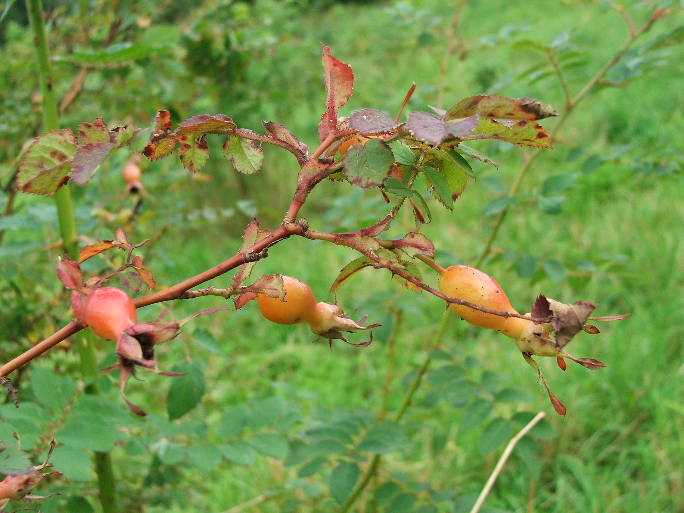 Morfoloģija. Vasarzaļš, līdz 3 m augsts, blīvs krūms, atvases parasti neveido. Zari sarkanbrūni. Dzeloņi dzeltenīgi, uz ziedošiem dzinumiem zem lapām pa 2, taisni. Lapiņas 7-13, olveida eliptiskas, 1-4 cm garas, smalki zāģzobainas, kailas, vai tikai uz vidusdzīslas ar matiņiem. Ziedkopas nelielas. Ziedi 5-6 cm plati, tumši vīnsarkani. Vainaglapas otrādi olveida. Kātiņš ar dziedzerainiem sariem, ziedgultne un kauslapas sarainas vai gludas. Kauslapas ar garu lapveida piedevu. Augļi pudeļveida, ar izteiktu kakliņu, 5-6 cm gari, tumši oranžsarkani. Kauslapas stāvas, nenobirst. Zied jūnijā, augļi ienākas septembrī.