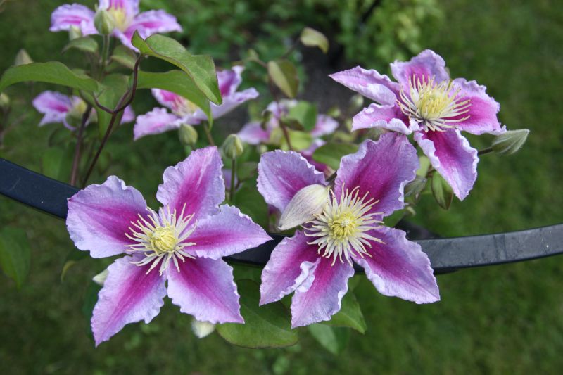 Morfoloģija. Lapas trīsdaivaini saliktas, var parādīties arī veselas lapas. Ziedi gaiši rozā, ar purpursarkanu svītru, 9 cm diametrā, ar 4-6 platām, eliptiskām lapām. Putekšņlapas dzeltenas. Ja neapgriež kātus ziemas periodam, tad nākamajā pavasarī izplaukst ziedi. Zied jūlijā - rudenī. Auglis mazs, ar garu, spalvai līdzīgu galu.