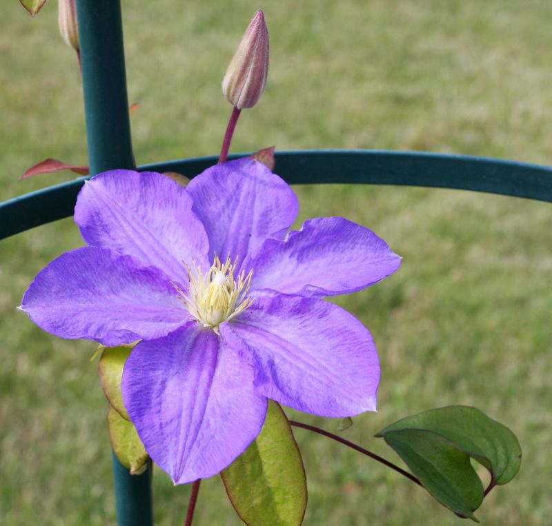 Morfoloģija. Lapas trīsdaivaini saliktas, var parādīties arī veselas lapas. Ziedi gaiši violeti zili, 20 cm diametrā, ar 6 platām, eliptiskām lapām. Putekšņlapas dzeltenas. Zied jūlijā - rudenī. Auglis mazs, ar garu, spalvai līdzīgu galu.