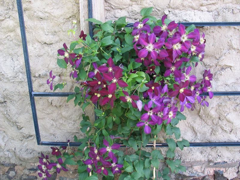 Morfoloģija. Lapas trīsdaivaini saliktas. Ziedi tumši purpursarkani, 8 cm diametrā, ar 4-6 platām, eliptiskām lapām. Putekšņlapas dzeltenas. Zied jūlijā - rudenī. Auglis mazs, ar garu, spalvai līdzīgu galu.