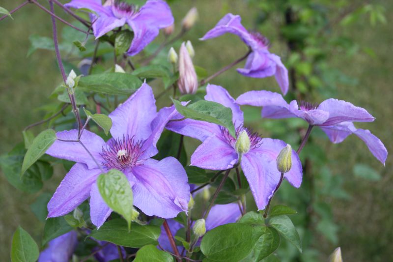 Morfoloģija. Spēcīgi augoša. Lapas trīsdaivaini saliktas. Ziedi violeti zili, var būt rozā svītra, 17 cm diametrā, ar 6 platām, eliptiskām lapām. Putekšņlapas brūnas. Zied jūlijā - rudenī. Auglis mazs, ar garu, spalvai līdzīgu galu.