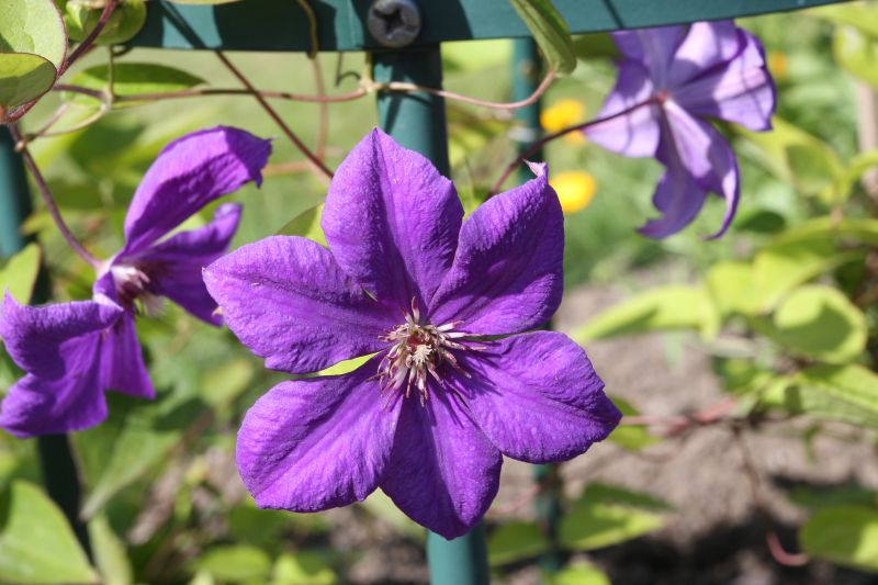 Morfoloģija. Lapas trīsdaivaini saliktas. Ziedi violeti zili, 14 cm diametrā, ar 5-6 olveida lapām. Putekšņlapas brūnas. Zied jūlijā - rudenī. Auglis mazs, ar garu, spalvai līdzīgu galu.