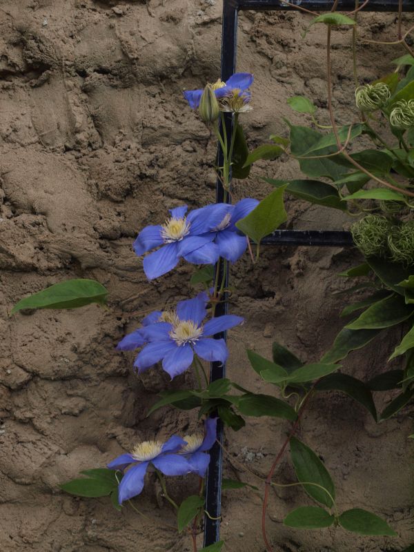 Morfoloģija. Lapas trīsdaivaini saliktas. Ziedi violeti, zili, 18 cm diametrā, ar 6 platām, eliptiskām lapām. Putekšņlapas dzeltenas. Zied jūlijā – rudenī. Auglis mazs, ar garu, spalvai līdzīgu galu.