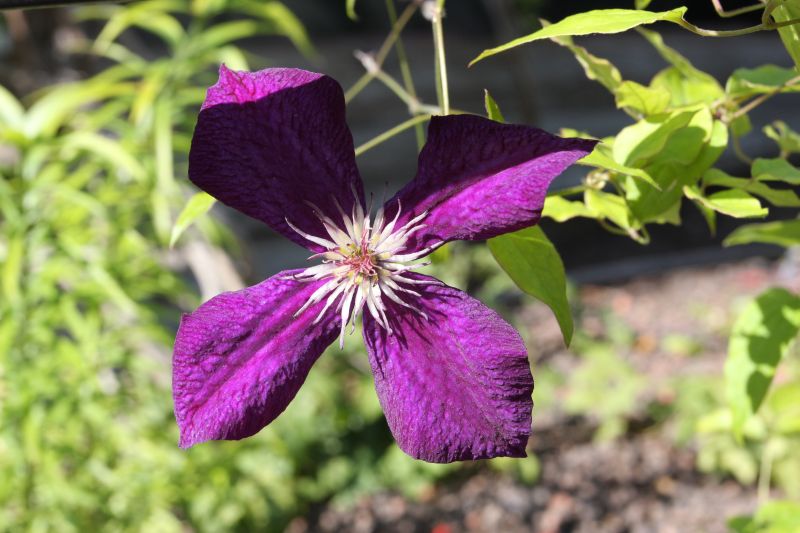 Morfoloģija. Ziedi tumši violeti, brūni, 15 cm diametrā, ar 6 olveida lapām. Auglenīca un putekšņlapas tumši violetas. Zied jūlijā - rudenī. Auglis mazs, ar garu, spalvai līdzīgu galu.