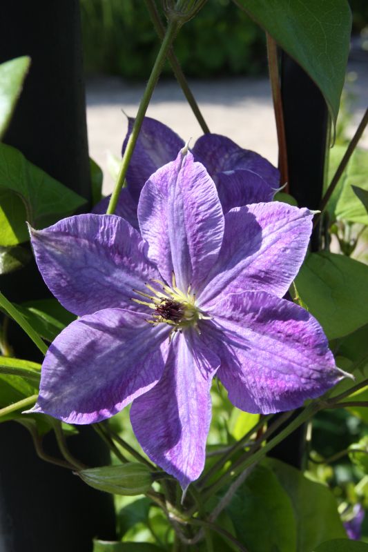 Morfoloģija. Ziedi gaiši violeti, zili, 15 cm diametrā, ar 6 platām, eliptiskām lapām. Auglenīca un putekšņlapas melnas, purpursarkanas. Zied jūlijā - rudenī. Auglis mazs, ar garu, spalvai līdzīgu galu.
