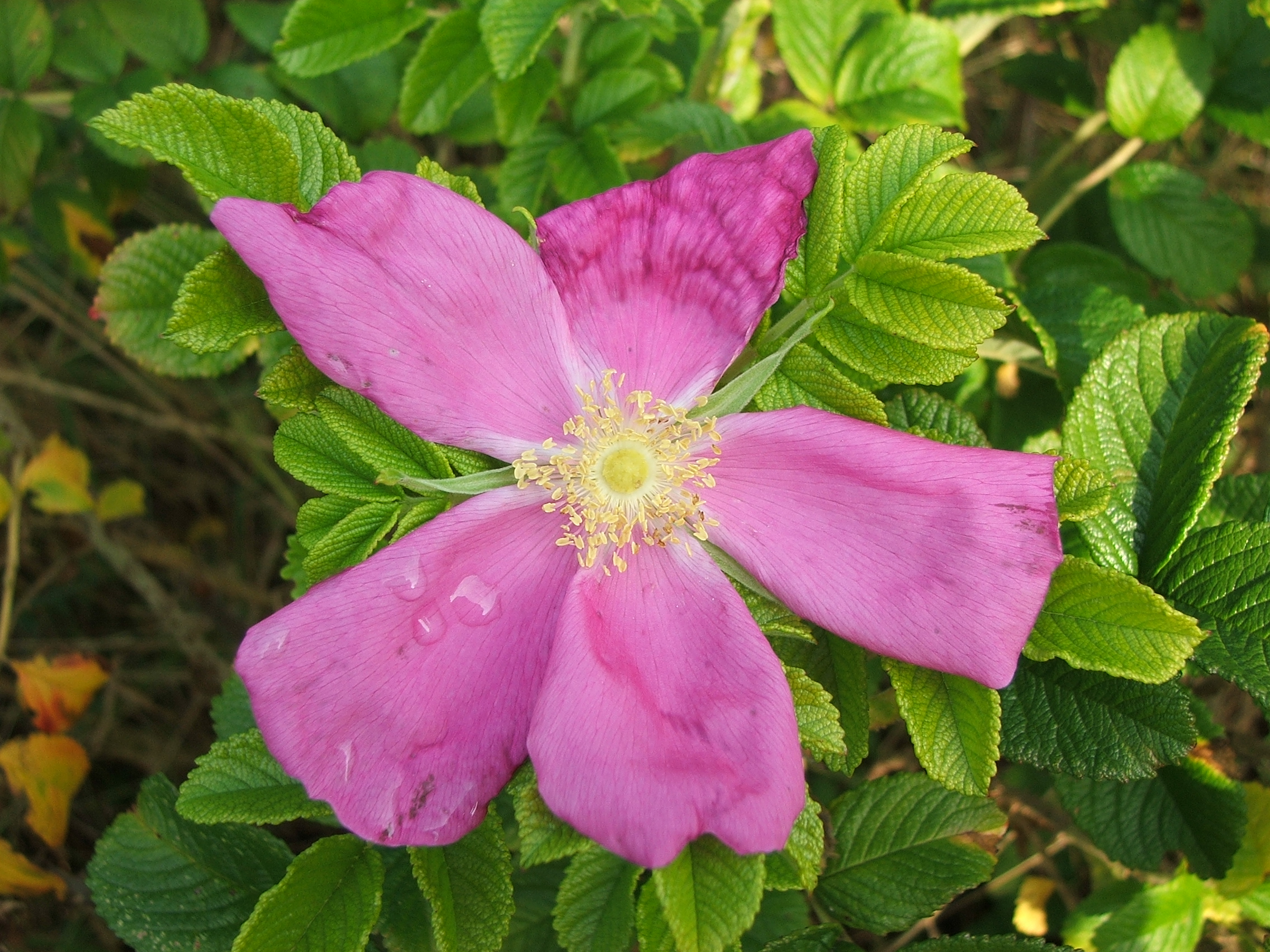 Morfoloģija. Vasarzaļš, ļoti spēcīgs, stāvs krūms. Dzinumi un dažāda lieluma daudzie dzeloņi mataini. Lapiņas rievainas, virspusē spīdīgas, tumši zaļas ,apakšpusē ar matiņiem, ādainas, saglabājas zaļas līdz salnām. Ziedi lieli, 6-12 cm plati, sarkani vai retāk balti. Ziedkāti un ziedgultne kaili vai daļēji ar matiņiem un dziedzerainiem sariņiem. Augļi lieli, sarkani, parasti saplacināti, gaļīgi, kauslapas nenobirst.