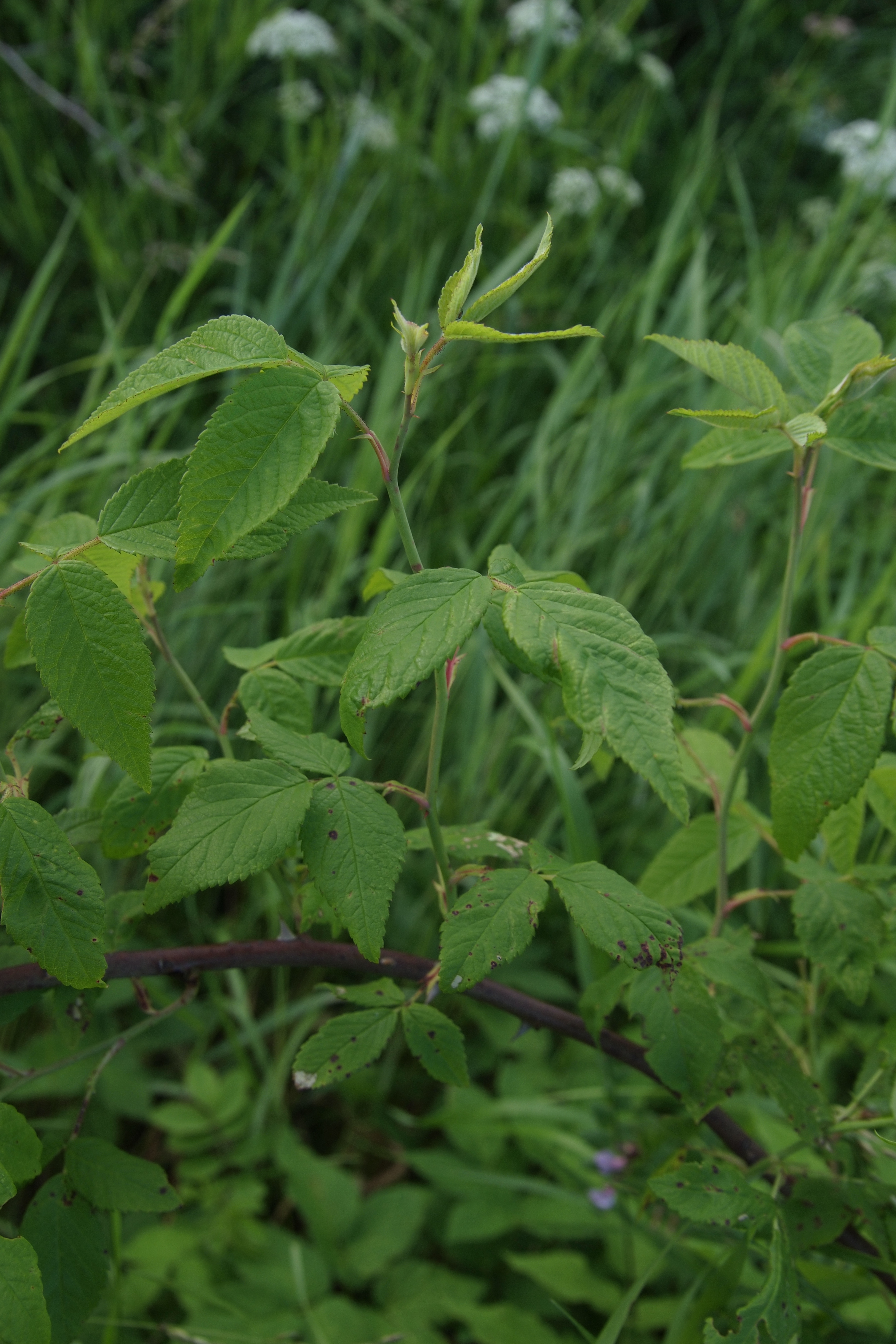 Morfoloģija. Vasarzaļš, 1-2 m augsts, pārkarens, blīvs krūms, atvases neveido. Dzeloņi izklaidus, spēcīgi, līki. Lapiņas 3-5, 3-9 cm garas, olveida iegarenas, ar zāģzobainām malām, virspusē gaiši zaļas, apakšpusē zilganzaļas, uz dzīslām ar matiņiem. Ziedi skrajos vairogos, 5-6 cm plati, tumši rozā. Augļi sīki ar dziedzerainiem sariņiem, zaļganbrūni. Zied jūnija beigās, jūlijā. Augļi ienākas oktobrī.