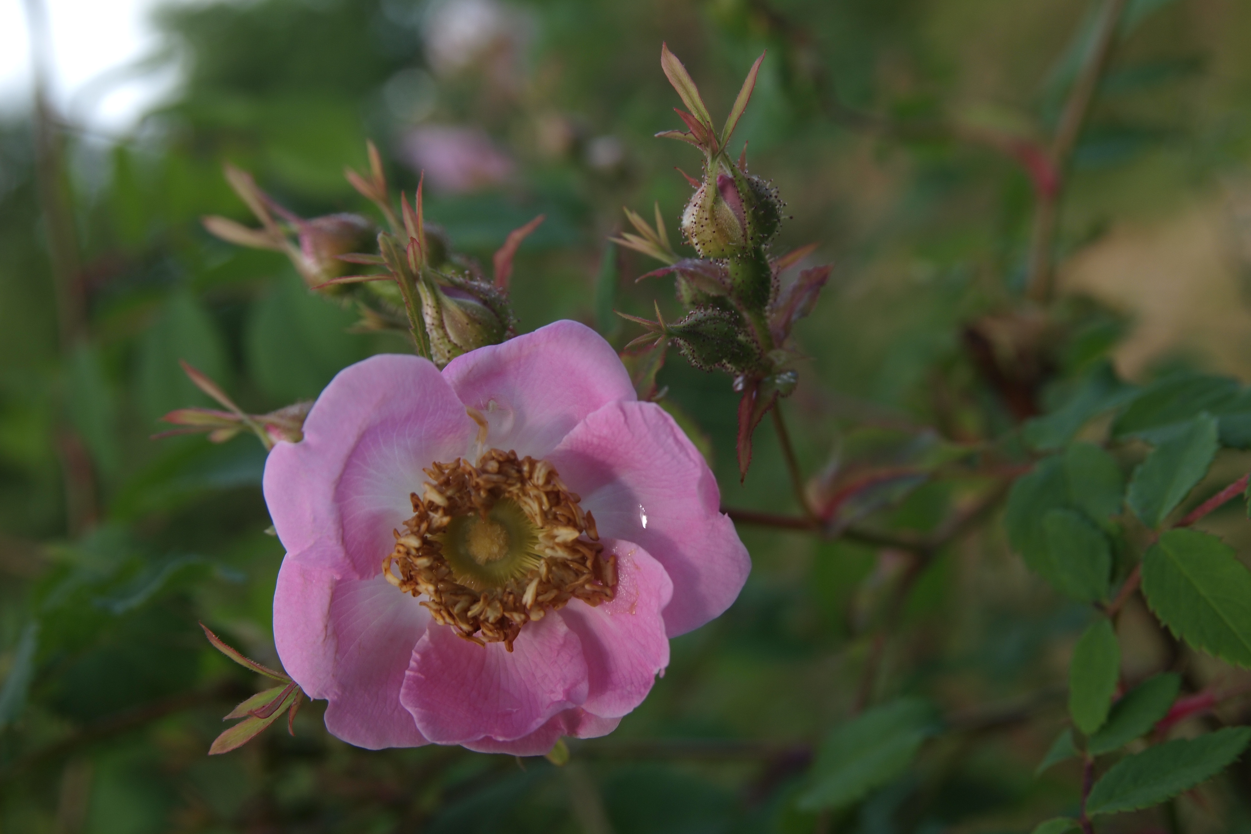 Morfoloģija. Vasarzaļš, līdz 3 m augsts, blīvs krūms ar stāviem vai viegli liektiem zariem. Atvases neveido, vai arī tās cieši pie krūma. Uz ziedošiem dzimumiem ērkšķi pāros, līdz 8 mm gari, līki, pie pamata saplacināti. Krūma lejasdaļā dzeloņu ļoti daudz un dažāda lieluma. Lapas līdz 17 cm garas. Lapiņas 7-9, virspusē tumši zaļas un kailas, apakšpusē ar matiņiem uz dzīslām, ar zobainām malām. Ziedi rozā, ap 5cm plati, skrajos vairogos. Ziedgultne un zieda kātiņš ar daudziem dziedzerainiem sariņiem. Šī pazīme atspoguļota sugas nosaukumā. Augļi 2,5 cm gari, iegareni, ar šauru kakliņu, sarkani. Zied jūnijā, augļi nogatavojas septembrī.