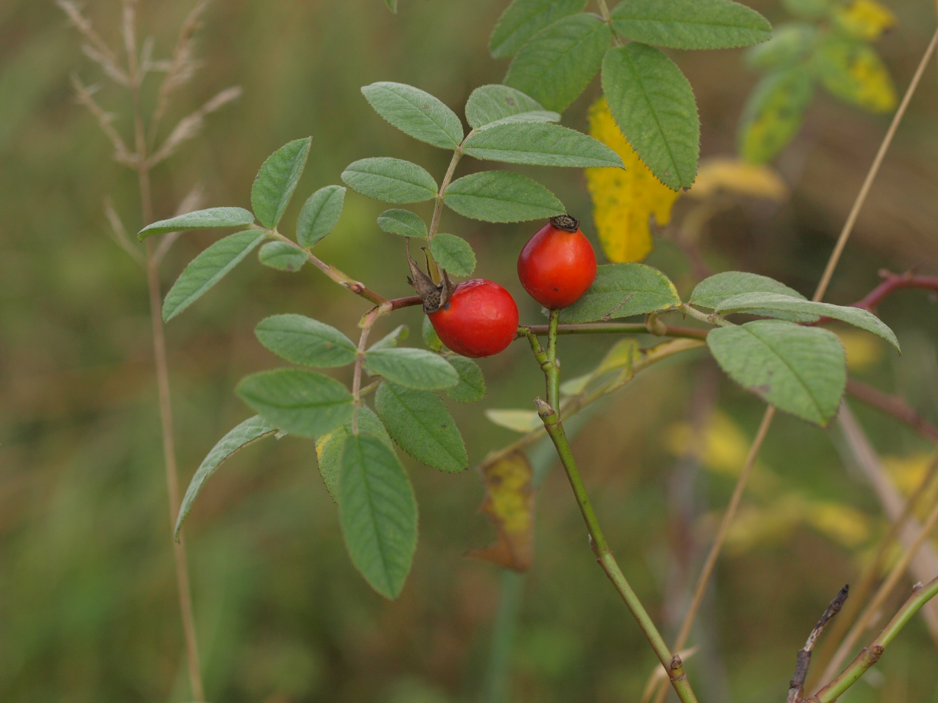 Morfoloģija. Vasarzaļš, līdz 2 m augsts, stāvs vai viegli pārkarens krūms. Dzeloņi spēcīgi, vienveidīgi, gandrīz taisni vai sirpjveidā izliekti, pie pamata platāki, saplacināti. Lapiņas 5-7, 2-6,5 cm garas, ieapaļas, iegareni eliptiskas, galotnē nosmailotas, divkārt zāģzobainas, virspusē zilganzaļas ar īsiem matiņiem, apakšpusē tūbainas un dziedzerainas. Ziedi pa vienam vai ziedkopās. Ziedu kāti 2-2,5 cm gari, klāti ar kātainiem dziedzerīšiem. Kauslapas matainas un dziedzerainas, pēc ziedēšanas vērstas augšup vai izplestas, pakāpeniski nobirst. Augļi apaļi līdz plati eliptiski, oranžsarkani vai spilgti sarkani, ar dziedzerainiem sariņiem.