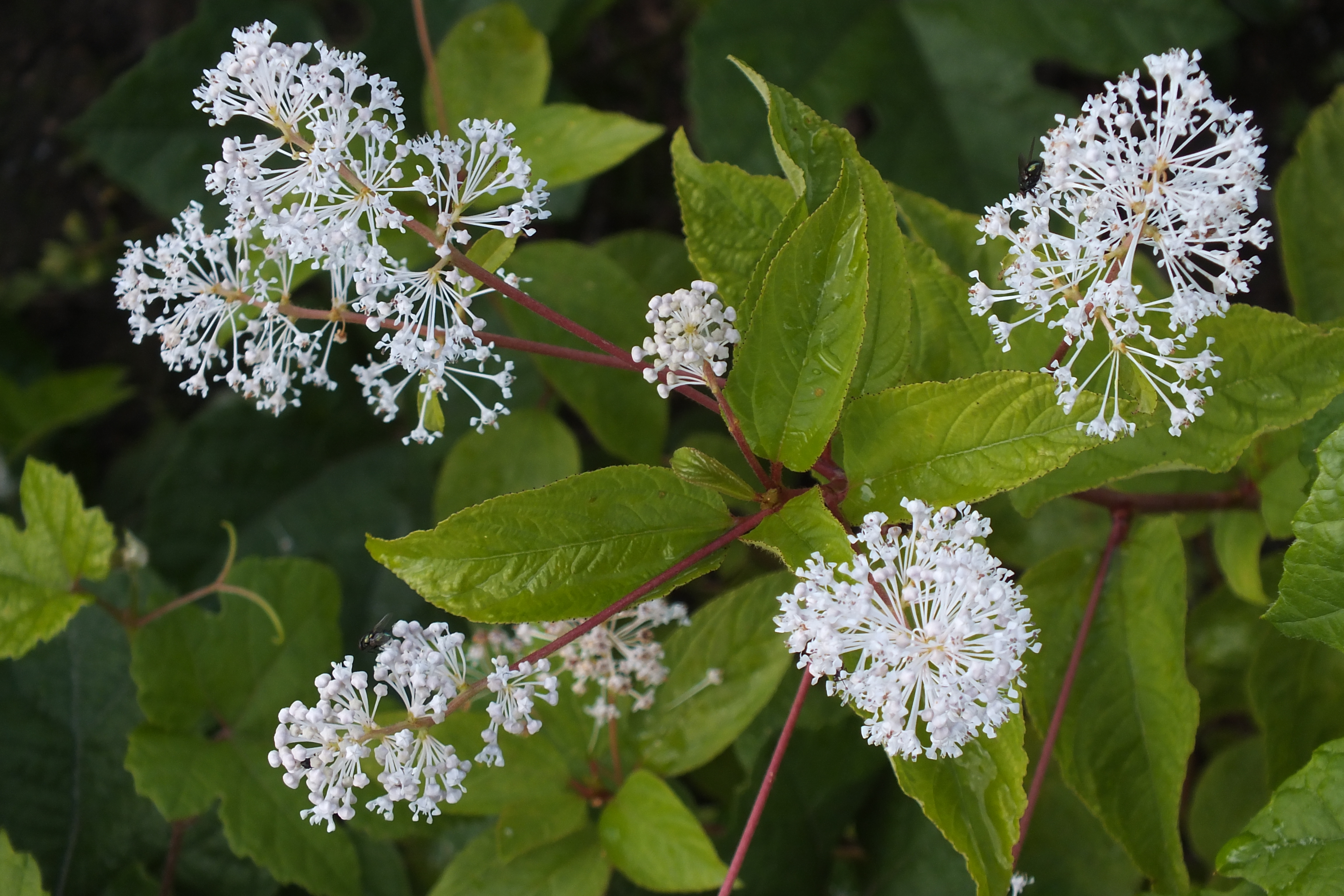 Morfoloģija. Vasarzaļš, līdz 1 m augsts krūms ar sarkanbrūniem, gludiem zariem un tumši sarkanām saknēm. Lapas olveidīgas vai eliptiskas 3-7 cm garas, galotnē pakāpeniski nosmailotas, ar noapaļotu, plati ķīļveidīgu vai viegli sirdsveida pamatu, ar smalki zāģzobainām malām, virspusē kailas, zaļas, bez spīduma, apakšpusē gaišākas, viegli matainas. Ziedkopas lapu žāklēs vai jauno dzinumu galos, pēc augļu nobiršanas tās nokalst. Ziedi smaržīgi, balti, ar tieviem baltiem kātiņiem, ap 3,5 mm plati, pušķos pa 5-10. Augļi sausi, 4-6 mm gari, melni vai brūni, trīsdaļīgi. Zied no jūnija beigām līdz augustam, augļi nobriest septembrī, oktobrī.