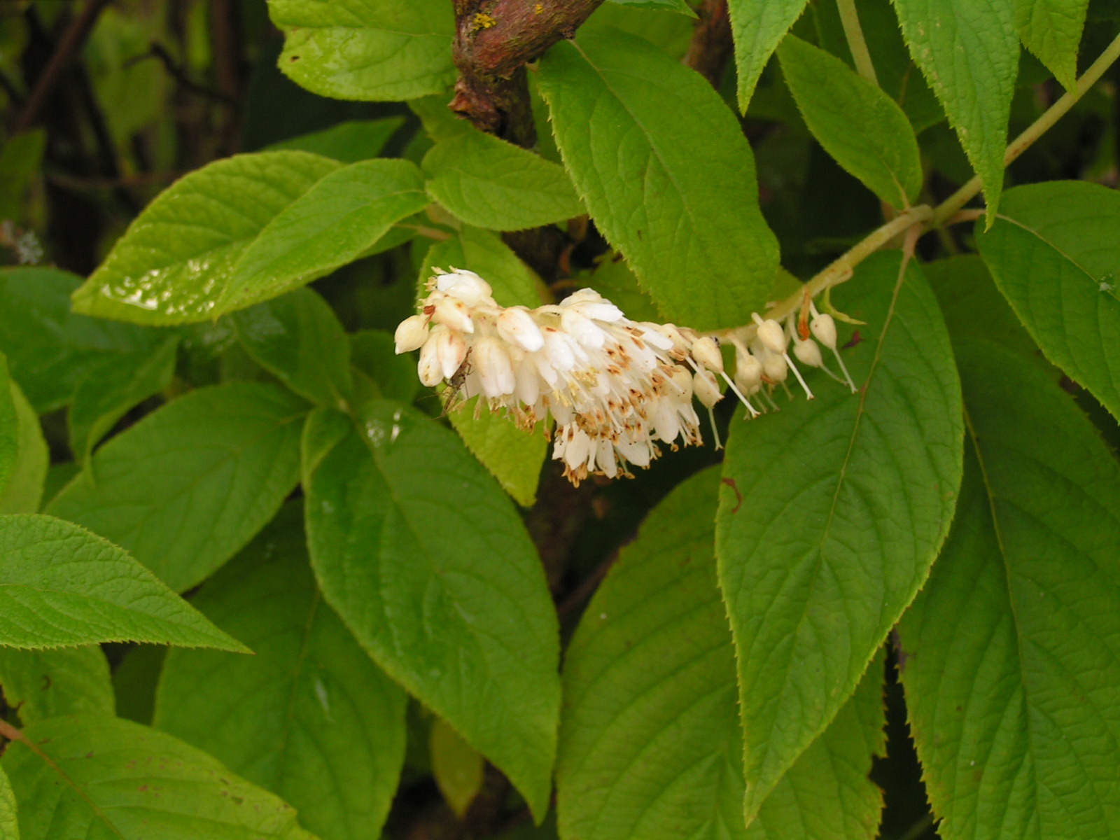 Morfoloģija. Vasarzaļš, 3-6 m augsts, parasti ložņājošs krūms vai mazs, tievs kociņš. Miza dažādu nokrāsu brūna, tā, lobās atklājot košo kanēļkrāsas iekšējo mizas slāni. Lapas olveidīgi iegarenas, 7-14 cm garas, gari nosmailotas, apakšpusē, vismaz, uz dzīslām ar matiņiem, tumši zaļas, rudenī skaisti dzeltenas. Ziedi garos, 5-20 cm galotnes ķekaros, balti, smaržīgi. Auglis ieapaļa, sausa pogaļa ar ļoti sīkām sēklām.