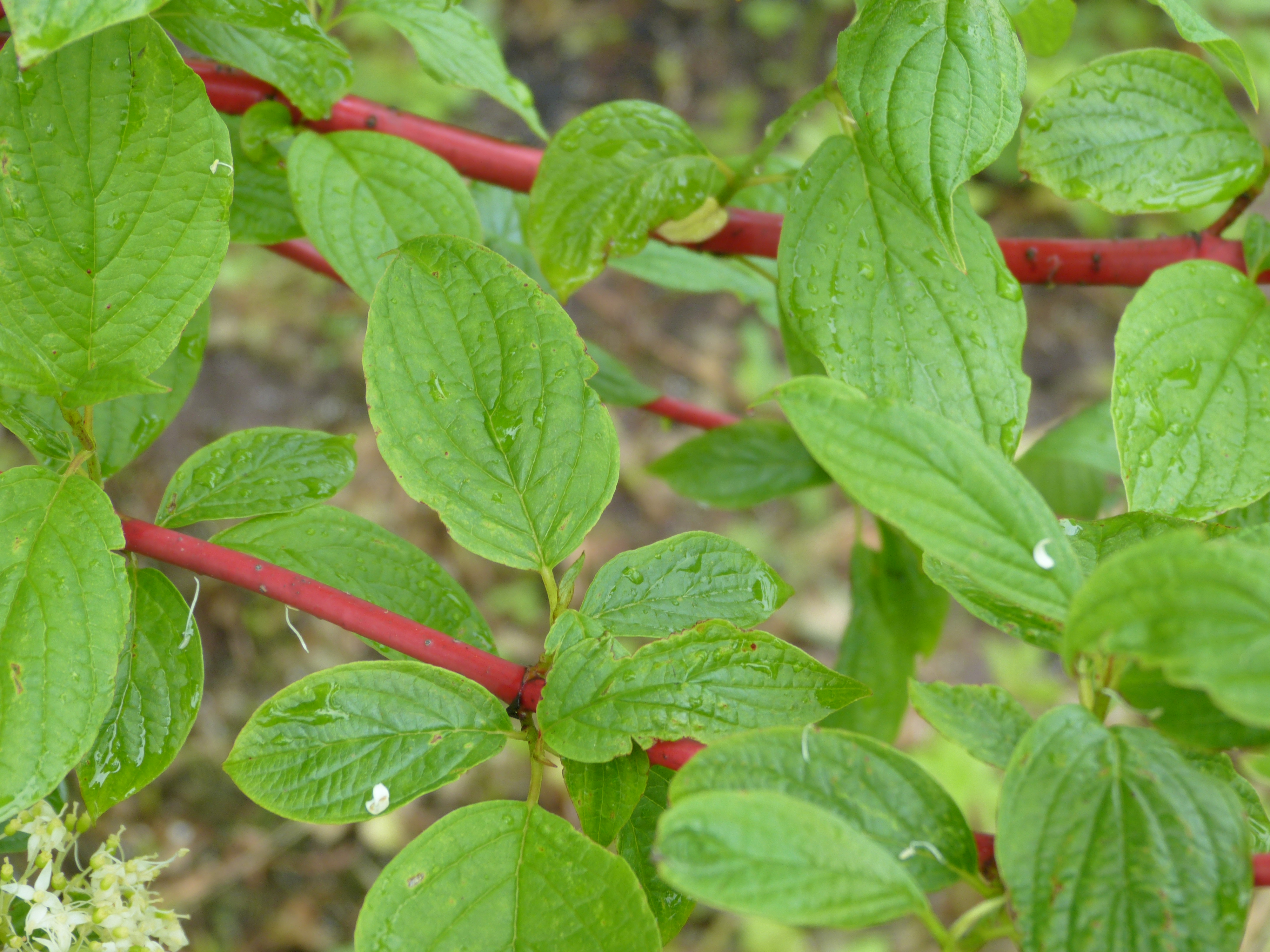Morfoloģija. Vasarzaļš, līdz 1,5-2 m augsts un līdz 1,5-2,5 m plats krūms. Viengadīgie dzinumi ļoti spilgti koraļsarkani. Lapas tumši zaļas, plati olveidīgas, rudenī krāsoja karmīnsarkanas. Ziedi vairogos, sīki un balti.