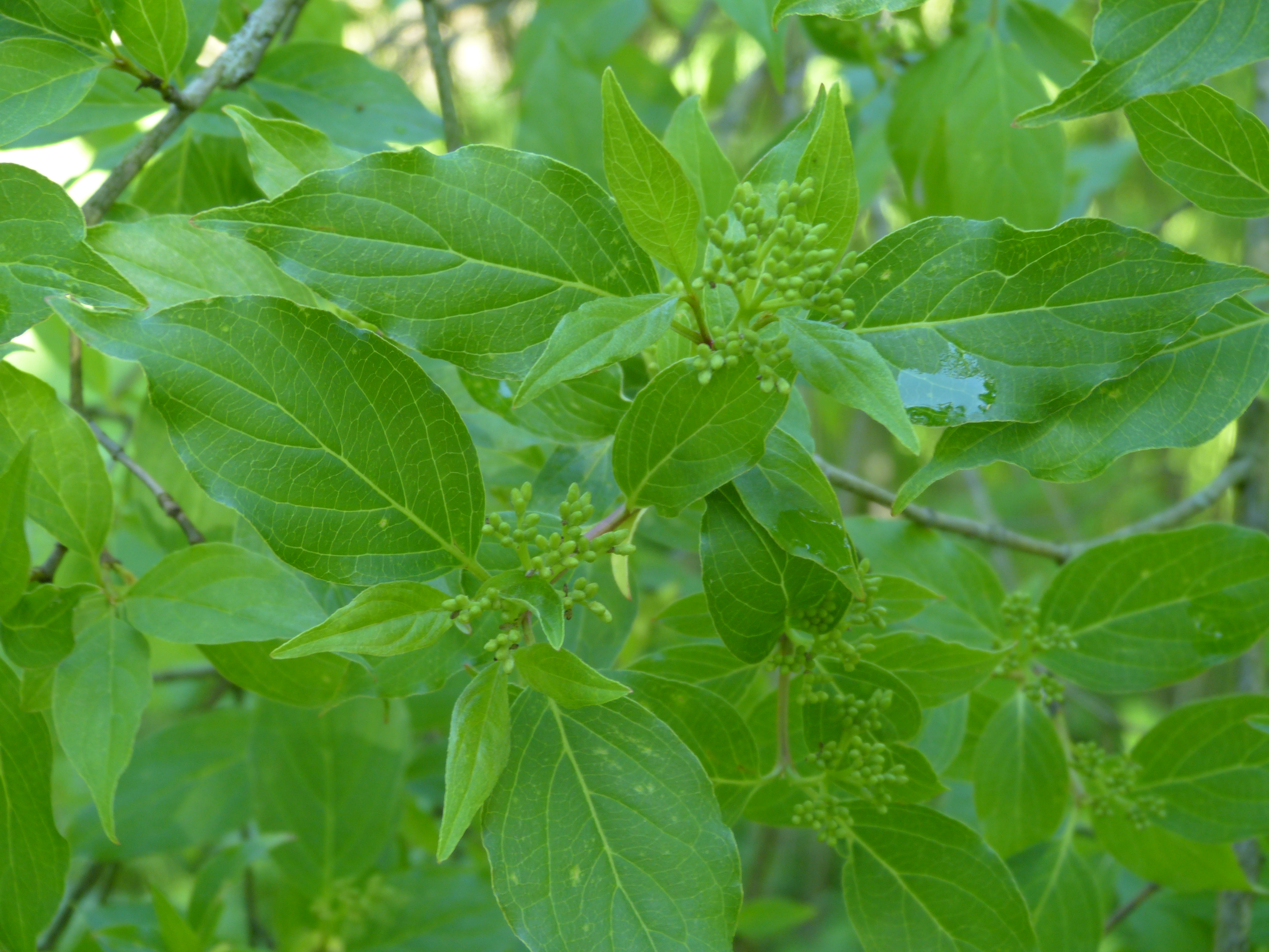 Morfoloģija. Vasarzaļš, līdz 5 m augsts krūms, kas bagātīgi veido atvases. Dzinumi nedaudz stūraini, dzeltenbrūni līdz sarkanbrūni, kaili. Lapas šauri eliptiskas līdz olveidīgi lancetiskas, 4-10 mm garas, ar gari nosmailotu galotni un ķīļveidīgu pamatu, abpusēji ar pieplakušiem matiņiem vai kailas, apakšpusē zilganas. Ziedkopas vairogveidīgi ķekari, 3-6 cm platas, samērā skrajas. Vainaglapas iegarenas, baltas. Kaulenis balts vai zilganbalts. Zied maija beigās jūnija sākumā, augļi nogatavojas augustā, septembrī un pakāpeniski nobirst, taču līdz pat ziemas vidum saglabājas koši sarkanie augļu kātiņi.