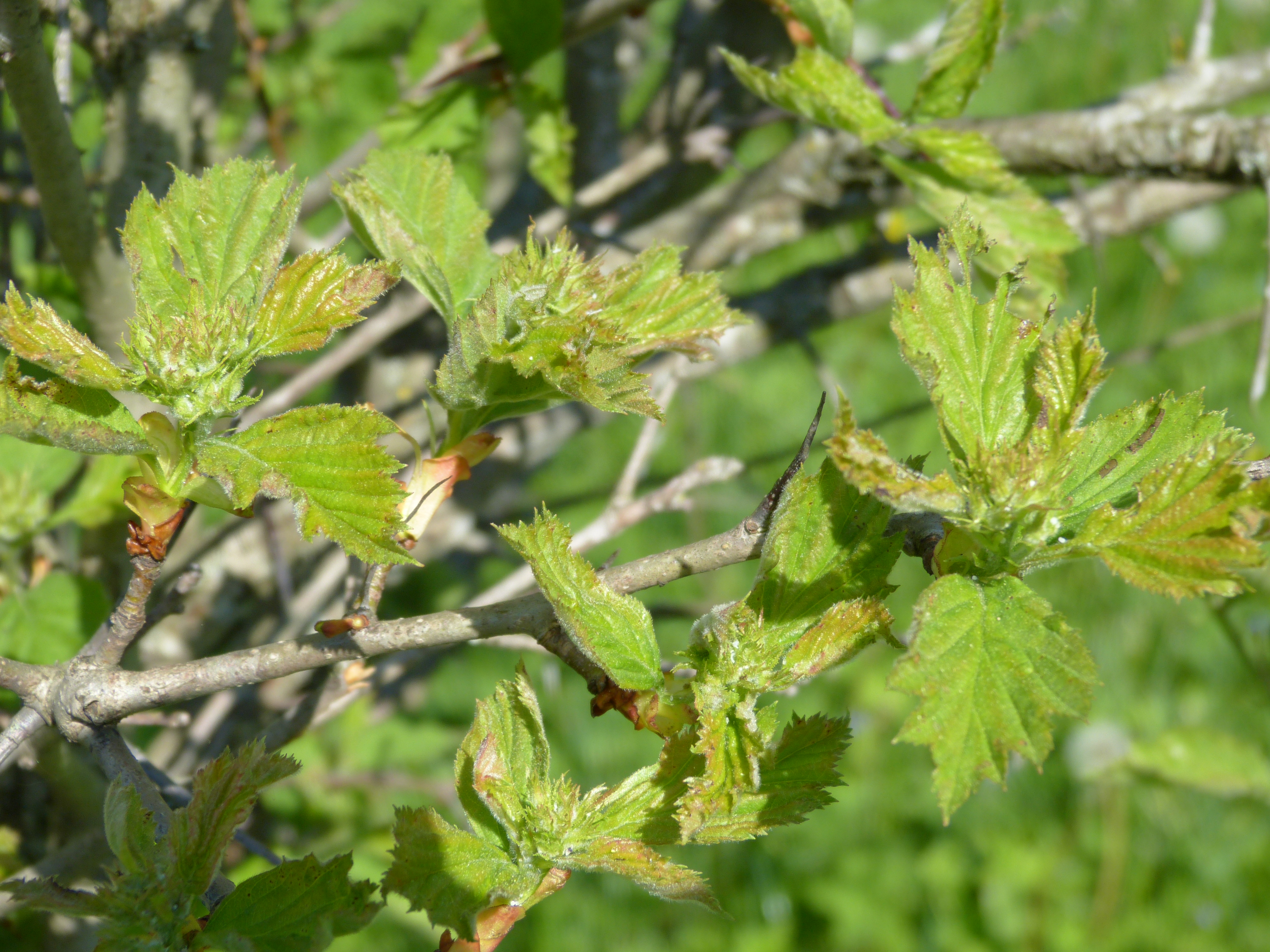 Morfoloģija. Vasarzaļš, līdz 5 m augsts koks. Dzinumi kaili, purpursarkani, ar baltām lenticelēm. Ērkšķu nav vai esošie līdz 2 cm gari. Lapas 3,5-8 cm garas, 2,5-6 cm platas, olveidīgas vai trīsstūraini olveidīgas, ar nošķeltu vai ķīļveida pamatu, ar 5-9 daivām, virspusē zilganzaļas, kailas. Ziedkopas īsākas, nekā lapas un, tāpat kā ziedgultne, kailas. Vainags balts, 10-12 mm plats. Augļi dzelteni vai oranždzelteni, apaļi vai saplacināti, 8-10 mm gari. Kauslapas atliektas un piespiestas pie augļa. Kauliņi 3-5. Zied maijā, augļi nogatavojas septembrī.
