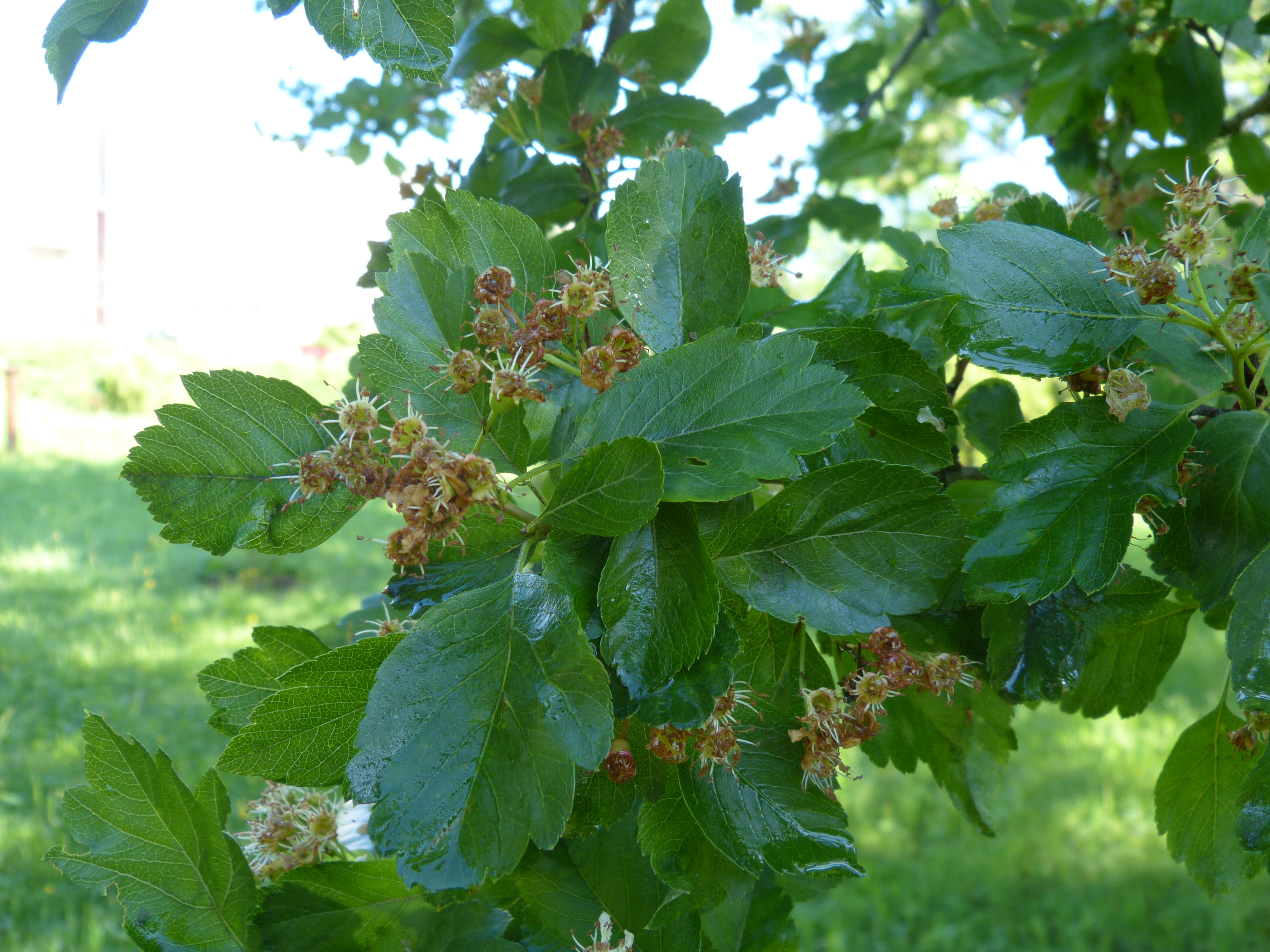 Morfoloģija. Vasarzaļš, 6-7 m augsts kociņš ar plati sazarotu vainagu. Dzinumi brūni vai purpursarkani, viegli spīdīgi. Ērkšķi 1,5-2 cm gari. Lapas 2-9 cm garas un1-6 cm platas, olveidīgas, otrādi olveidīgas, eliptiskas vai lancetiskas. Lapas plātne lejasdaļā ar veselu malu, augšdaļā malas dziedzeraini zāģzobainas, ar 3-7 daivām. Lapas biezas, gandrīz ādainas, virspusē blāvi zaļas, ar retiem matiņiem gar vidusdzīslu, apakšpusē ar retiem matiņu pušķiem dzīslu stūros. Ziedkopas īsākas par lapām, ar 10-17 ziediem, kailas. Vainags balts, ap 10 cm plats. Augļi melni purpursarkani vai melni, gandrīz apaļi, ap 1 cm plati, spīdīgi, ar atliektām kauslapām. Kauliņi 4-5. Zied maijā, jūnijā, augļi nobriest augusta beigās, septembrī un drīz nobirst.