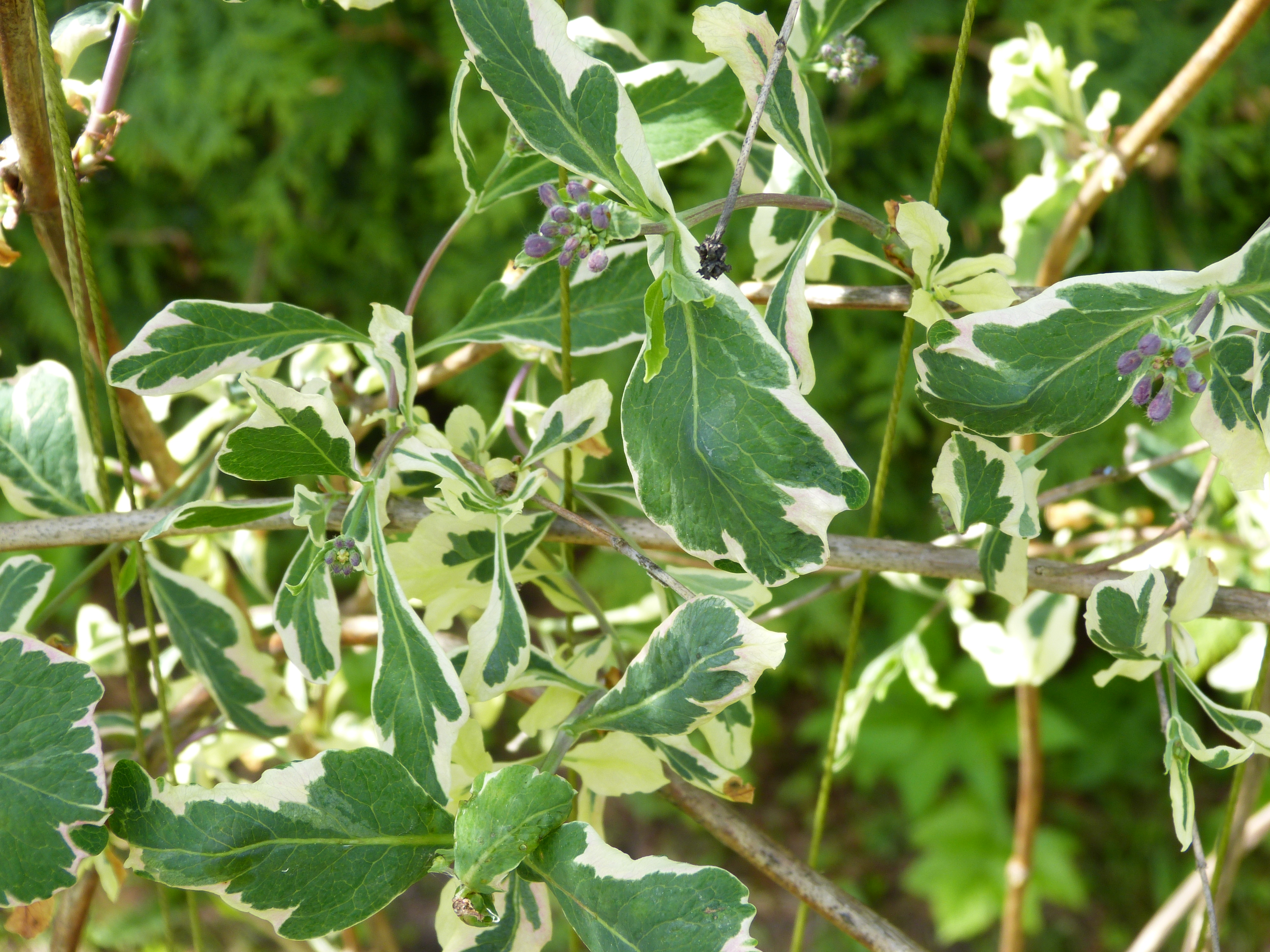 Morfoloģija. 4-6 m augsts vīteņaugs. Lapas olveidīgi eliptiskas līdz iegarenas, zaļas ar krēmbaltu apmali, plaukstot rozīgi krēmbaltas. Ziedi trompetveida, pumpurā koši rozā, izplaukstot krēmkrāsas līdz balti, smaržīgi.
