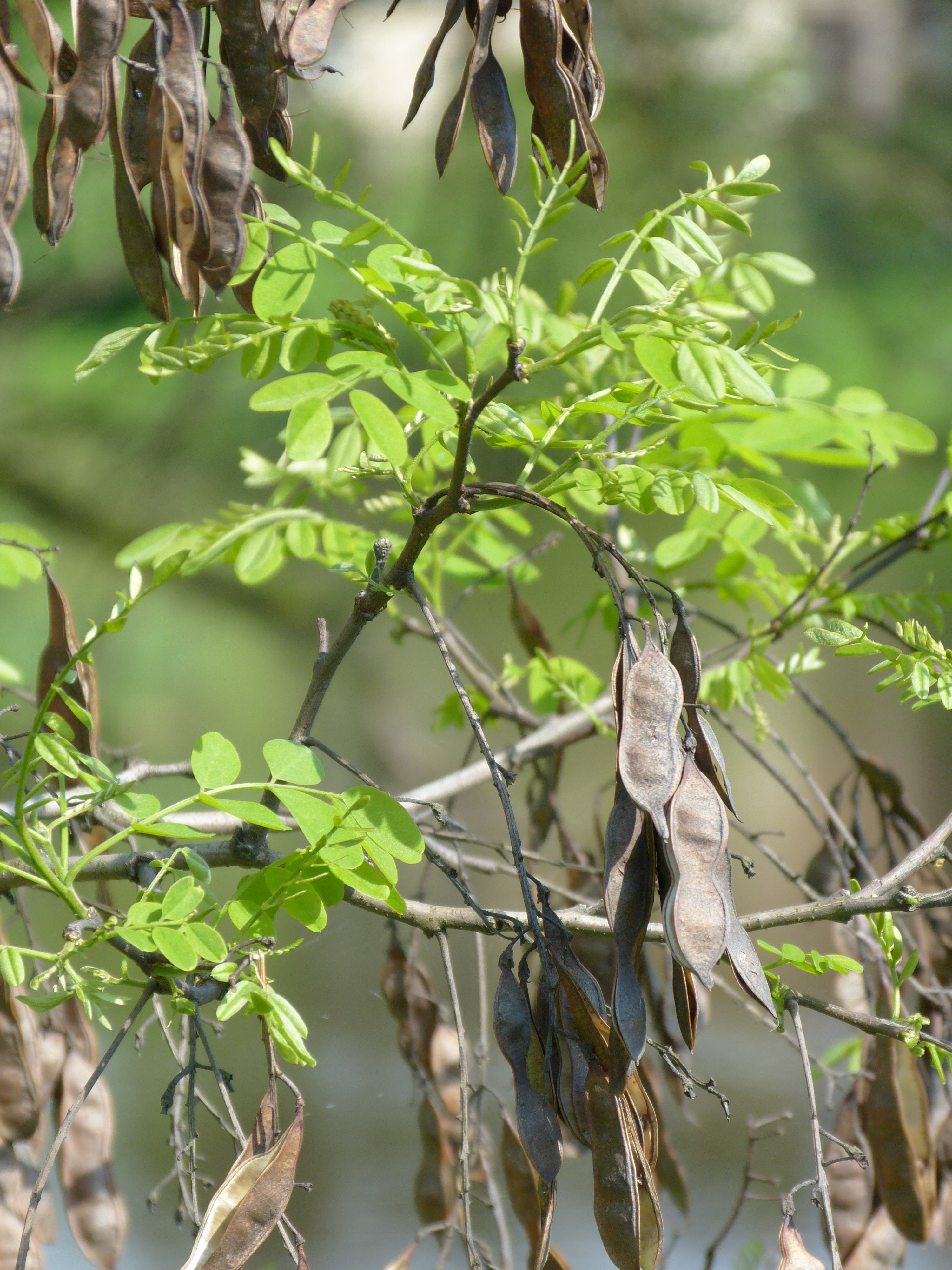 Morfoloģija. Vasarzaļš, līdz 25 m augsts koks. Miza pelēkbrūna, bieza, saplaisā. Dzinumi kaili vai viegli mataini, šķautņaini, olīvzaļi līdz sarkanbrūni. Lapas 10-25 cm garas, ar pielapēm, kas pārveidojušās par dzeloņiem. Lapiņas 9-19, eliptiskas, 2-4 cm garas, nobriedušas kailas. Ziedkopas 10-20 cm garas, nokarenas. Ziedi balti, smaržīgi, 6-12 cm gari. Kauss plati zvanveida, blīvi klāts ar rudiem matiņiem. Pākstis iegareni lineāras, plakanas, 5-12 cm garas, kailas, ar 3-15 sēklām. Zied jūnijā, pākstis nobriest augustā un ilgi saglabājas koka zaros.