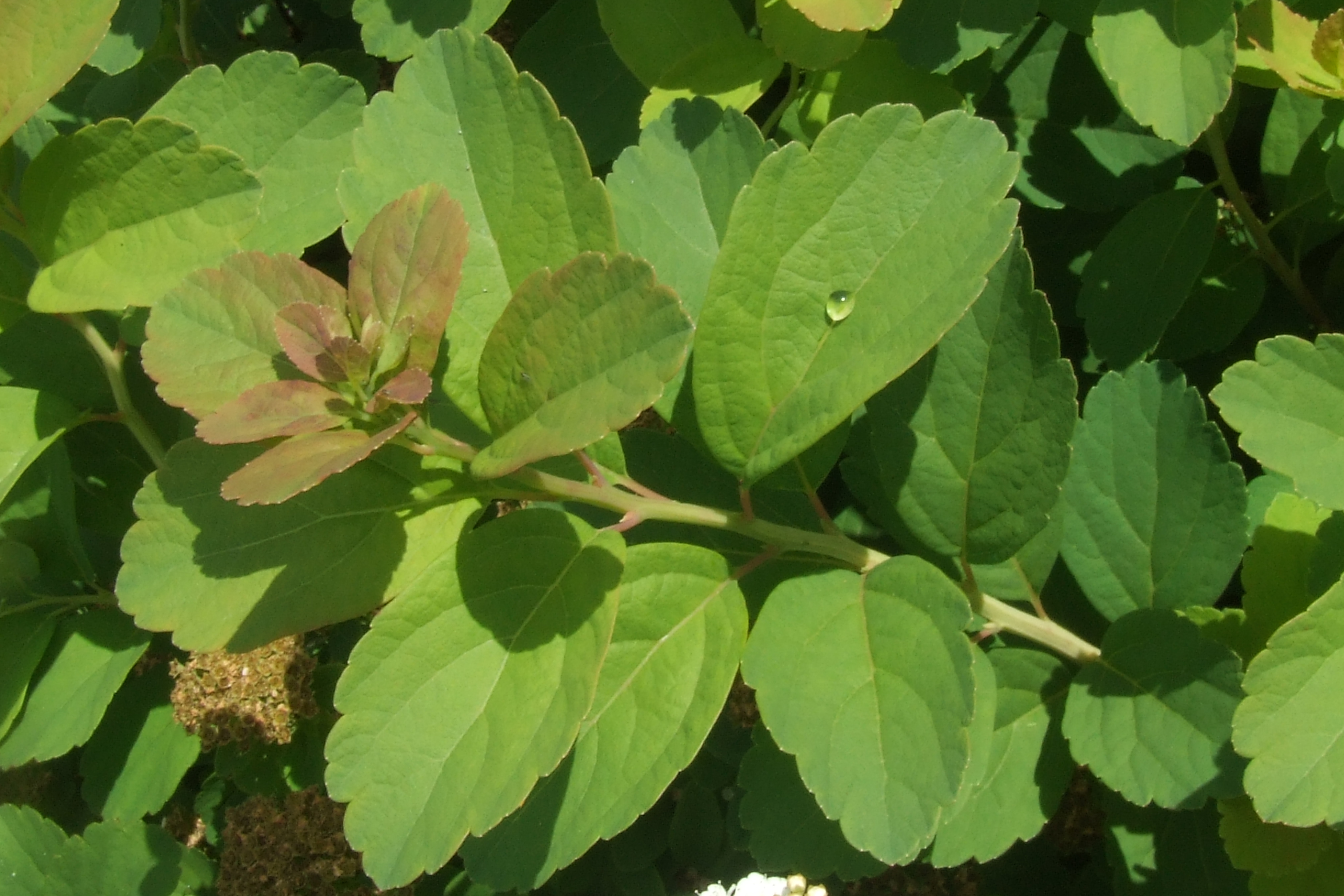Morfoloģija. Līdz 1 m augsts krūms. Lapas plati olveida līdz ieapaļas, 2-4 cm garas, ar zobainu vai dubultrobainu malu, kailas vai apakšpusē uz dzīslām nedaudz pūkainas. Rudenī krāsojas oranžos un sarkanīgos toņos. Ziedi balti, sakārtoti blīvās vairogveida ziedkopās. Zied V-VIII.