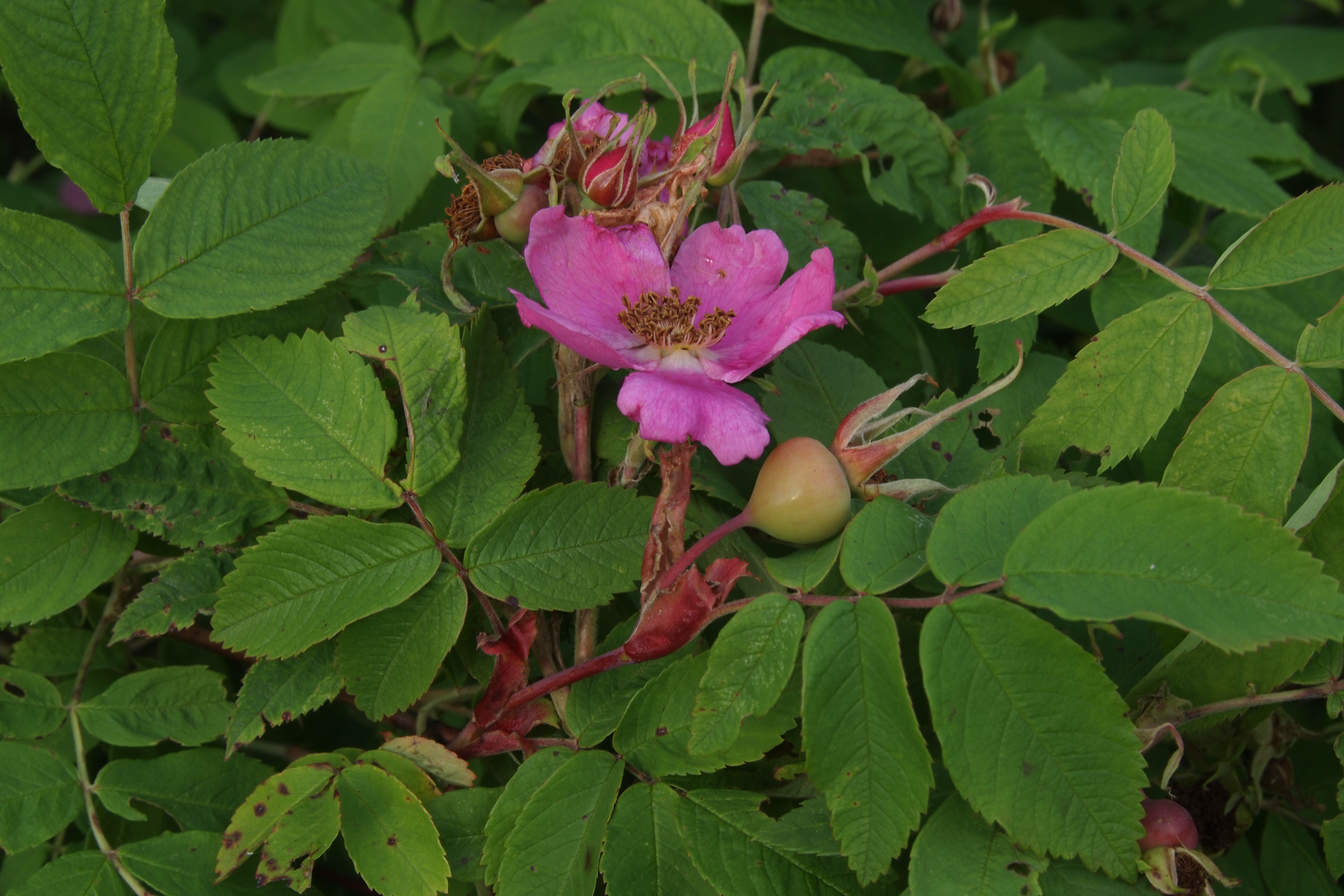 Morfoloģija. Vasarzaļš, 1,5-2 m augsts, stipri sazarots krūms, bagātīgi veido atvases. Jaunie zari sarkanbrūni, ar zilganu apsarmi. Dzeloņi pāros pie lapu pamatnes, gandrīz taisni. Lapiņas 7, 4-8 cm garas, iegarenas vai ovālas, virspusē kailas, apakšpusē matainas. Pielapes ļoti plānas, strupas. Ziedi tumši rozā. Augļi 1-1,5 cm plati, apaļi vai iegareni, sarkani, ar stāvām kauslapām, kas nenobirst. Zied jūnijā, augļi nogatavojas augustā.