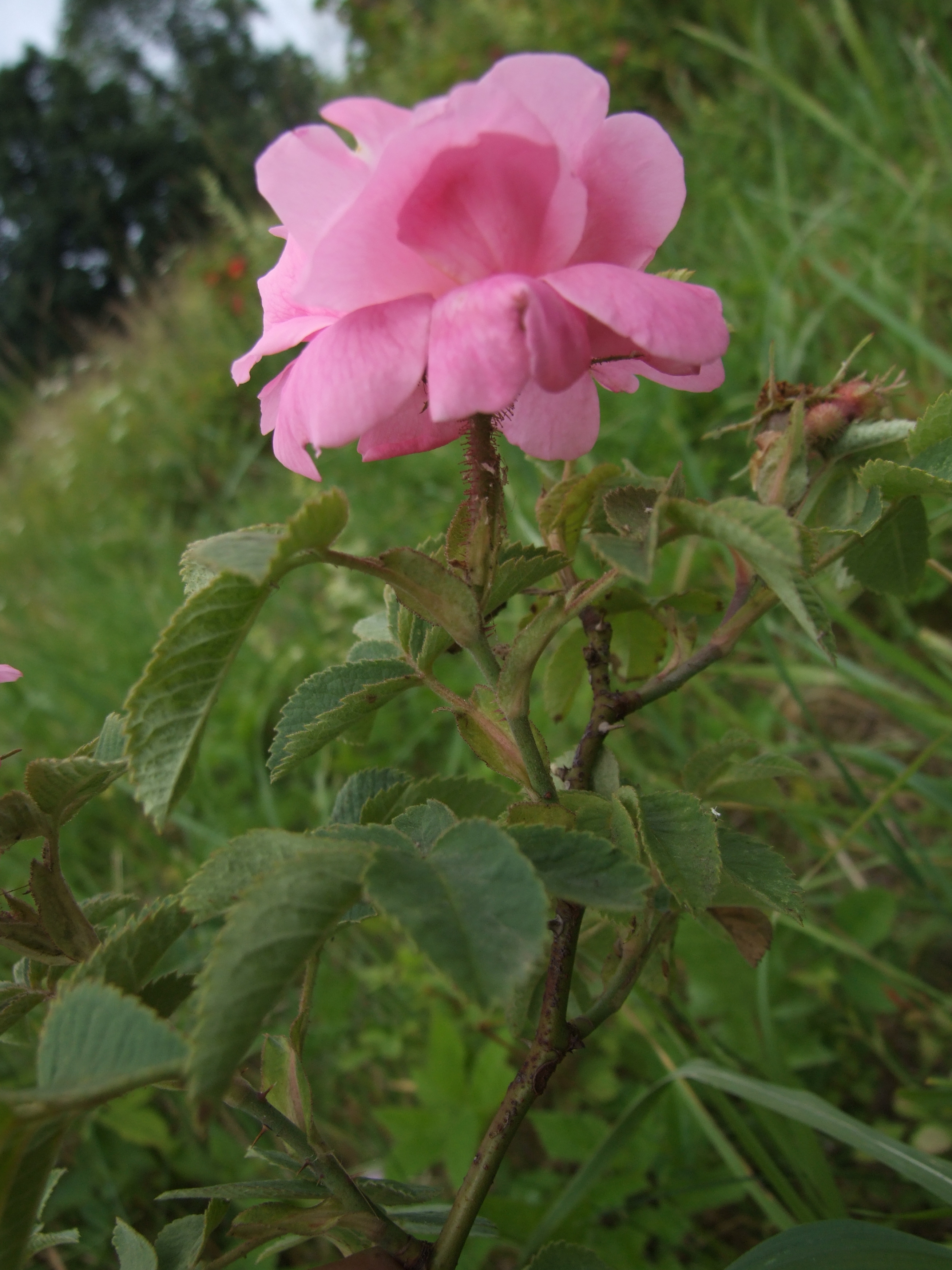 Morfoloģija. Vasarzaļš, stāvs, līdz 2,5 m augsts, blīvs krūms ar nedaudzām atvasēm. Dzeloņi izklaidus, īlenveida, salmu dzelteni, mazliet augšup vērsti. Lapas lielas, 8,5-9 cm garas, gan kāts, gan pielapes mataini un dziedzeraini. Lapiņas 5-9, 4-5 cm garas un 2,5-3 cm platas, plati eliptiskas, abpusēji blīvi klātas ar matiņiem un dziedzerīšiem, pēdējie augam piedod sveķu smaržu. Ziedi pa vienam vai nelielā ziedkopās, ar īsiem dziedzeraini sarainiem kātiņiem. Vainaglapas tumši rozā. Kauslapas garākas par vainaglapām, ārējās plūksnainas, tāpat kā ziedgultne, ar kātainiem dziedzeriem, pie gataviem augļiem stāvas, nenobirst. Augļi gandrīz apaļi, līdz 3 cm plati, oranži līdz tumši purpursarkani. Latvijā zied jūnijā, augļi ienākas augustā un drīz pēc tam nobirst arī lapas.