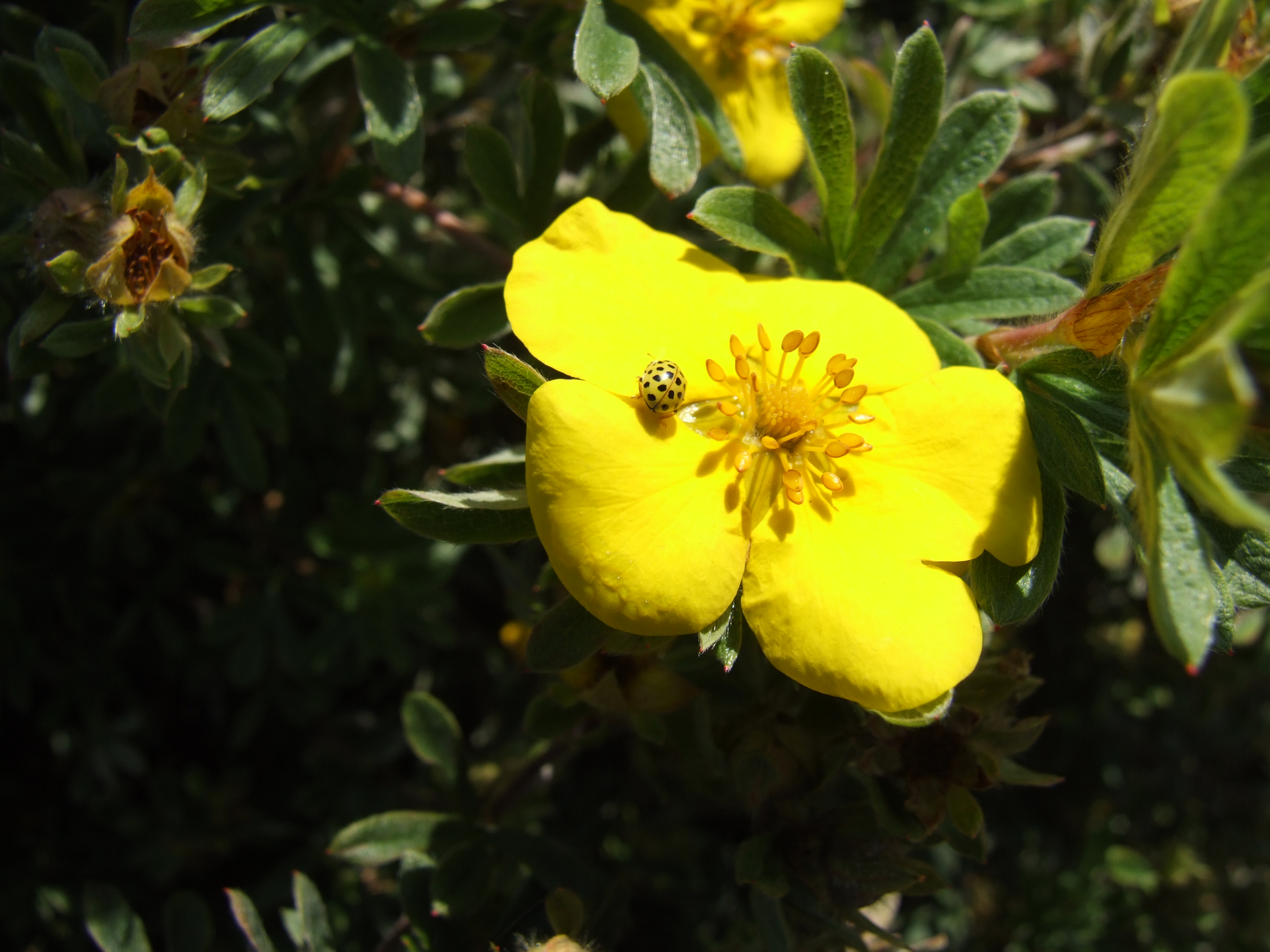 Morfoloģija. Vasarzaļš, spēcīgs, 0,5 – 1 m augsts un 0,8 – 1,3 m plats, stāvs krūms. Ziedi 3,5 cm plati, zelta dzelteni. Zied no jūnija līdz oktobrim. Lapas pelēkzaļas vai zilganzaļas.