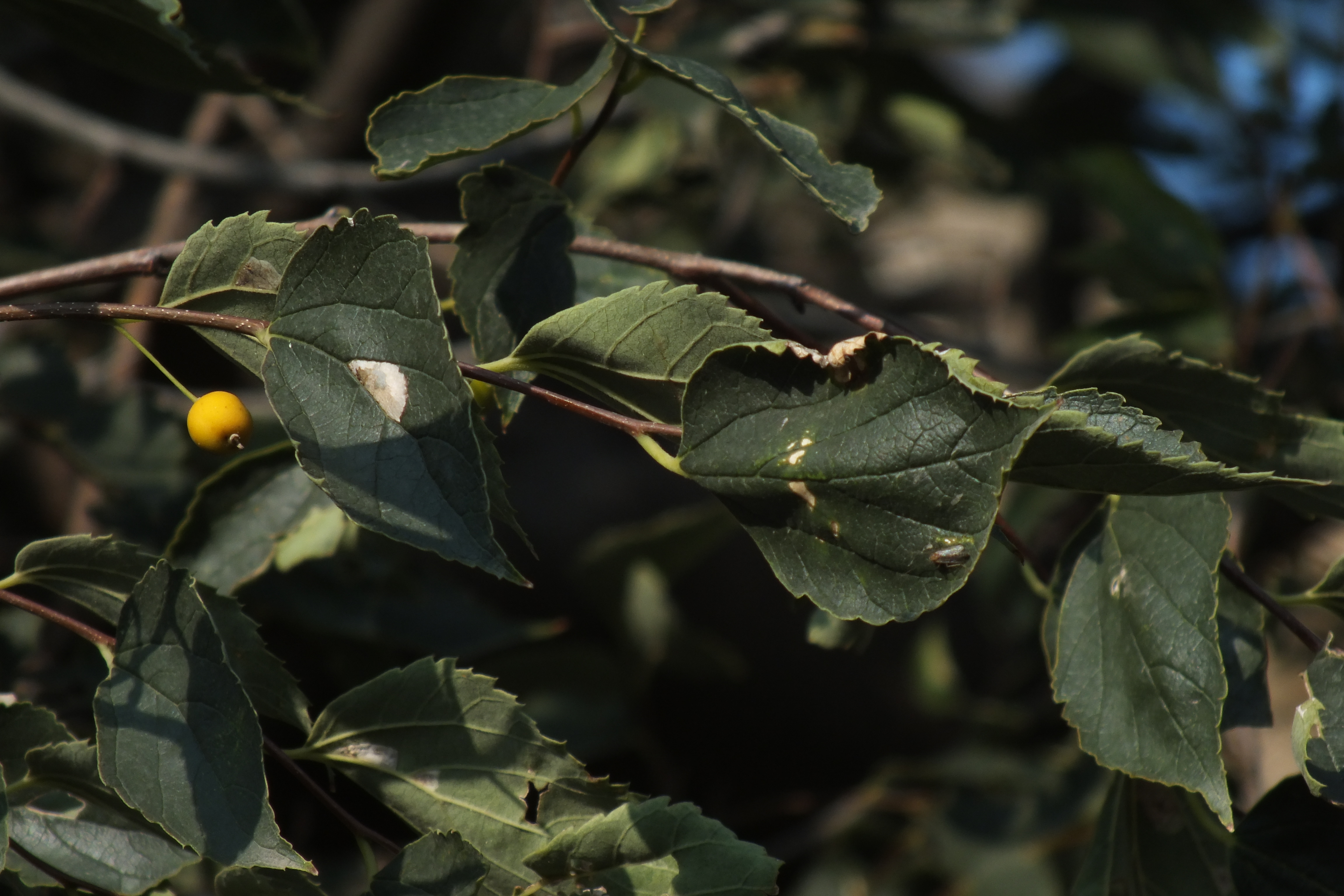 Morfoloģija. Vasarzaļš, 10-12 m augsts koks vai krūms. Miza gluda, pelēka. Jaunie dzinumi brūni vai sarkanbrūni. Lapas ādainas, olveidīgas, ar īsi nosmailotu galotni un noapaļotu vai ķīļvieda asimetrisku pamatu, asi zobainas, virspusē raupjas, apakšpusē ar matiņiem, 4-10 cm garas, rudenī sārtojas. Ziedi divdzimumu vai tikai vīrišķie, neievērojami, lapu žāklēs vai dzinumu galos. Augļi kauleņi ar saldenu mīkstumu, apaļi, sarkandzelteni, ar zilganu apsarmi. Kauliņš viegli saplacināts, rievains. Zied aprīlī, maijā, augļi nogatavojas septembrī, oktobrī.