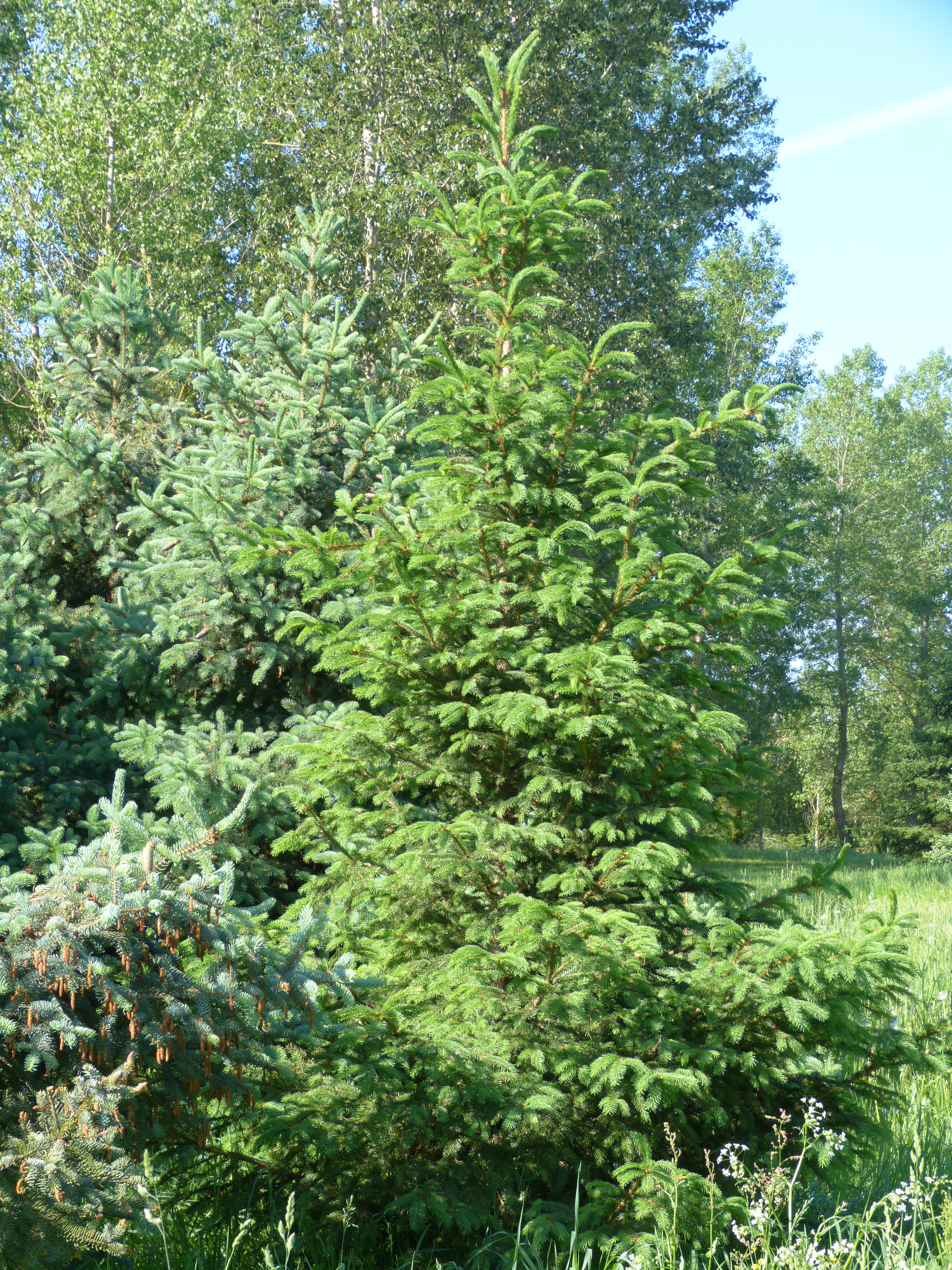 Morfoloģija. Mūžzaļš, dzimtenē 30(45) m augsts koks. Vainags plati konisks vai piramidāls. Zari horizontāli atstāvoši, vecākiem kokiem izliekti, zaru gali liecas uz augšu. Miza pelēkbrūna, saplaisā, jaunie dzinumi dzeltenpelēki, spīdīgi, mataini. Pumpuri smaili, sveķaini, pumpurzvīņas piegulošas, galā nedaudz atliektas (!), skujas uz zariņiem radiāli, zilganzaļas, 10-20 mm garas, 1mm platas, četršķautnainas, uz katras plaknes ar 3-5 atvārsnīšu joslām, stīvas, asas, bieži izliektas. Čiekuri cilindriski, 8-14 cm gari, sākumā gaiši brūni, vēlāk kastaņbrūni. Čiekurzvīņas galā noapaļotas, cietas, koksnainas. Čiekurs nobriest oktobrī.