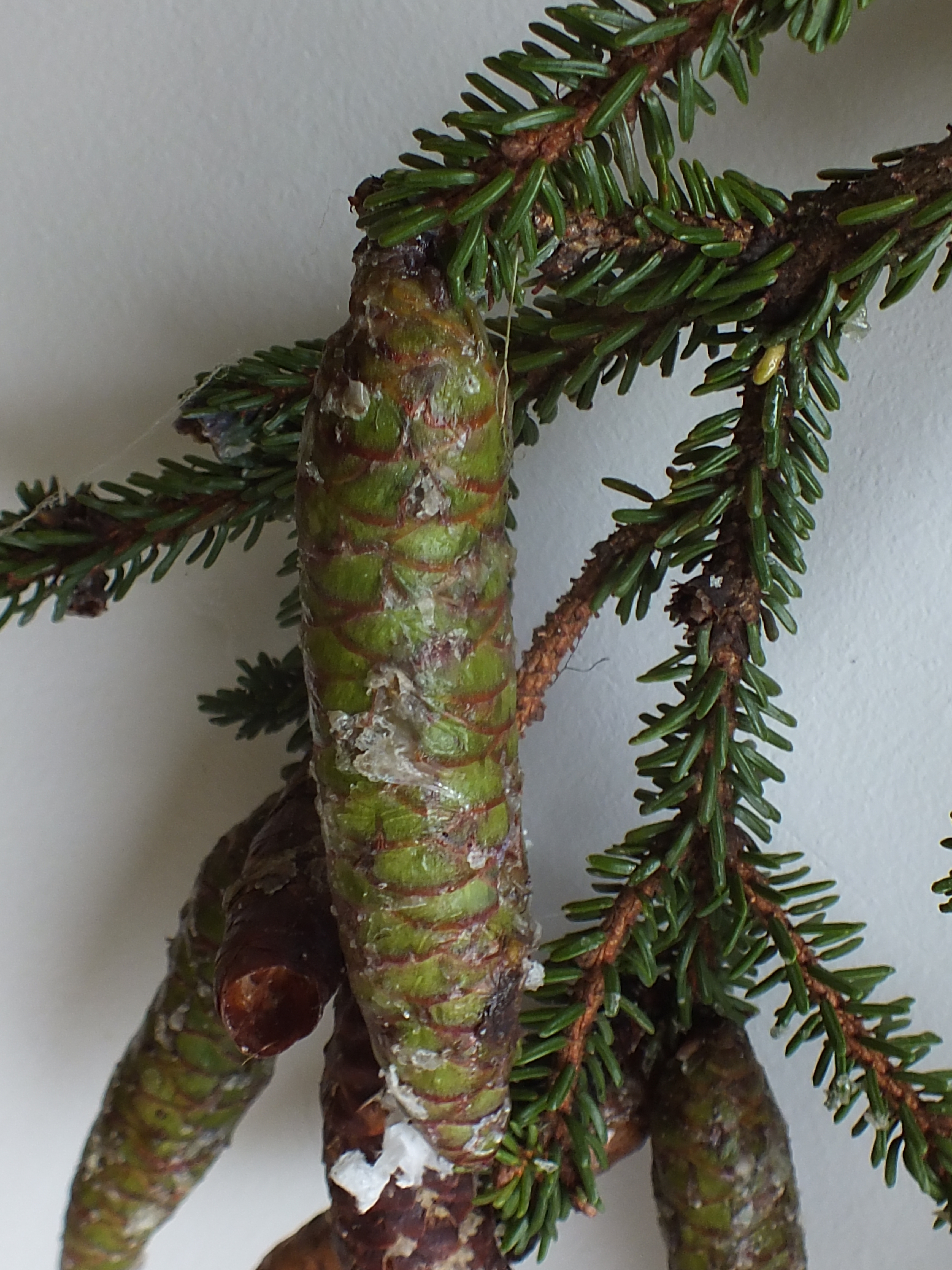 Morfoloģija. Mūžzaļi, dzimtenē 20-40 m, Latvijā 10-15 m augsti koki. Miza iesārti brūna līdz pelēcīga, zvīņaina. Zari neregulāros mieturos, pacili, horizontāli, retāk mazliet nokareni, blīvi. Jaunie dzinumi īsi, tievi, gaiši brūni līdz iedzelteni, klāti ar smalkiem matiņiem. Pumpuri koniski, smaili, 3 mm gari, bez sveķiem. Skujas ļoti īsas, ap 5 mm, cietas, tumši zaļas, piekļaujas dzinumam. Atvārsnītes uz visām 4 šķautnēm. Vīrišķie ziedi tumši sarkani, pēc tam kļūst dzelteni. Čiekuri vārpstveida cilindriski, 5-9 cm gari, 2-3 cm plati, nobriestot kļūst brūni, sveķaini. Čiekurzvīņu malas veselas. Sēklas melnīgsnējas, 5 mm garas. Spārns 12 mm garš.