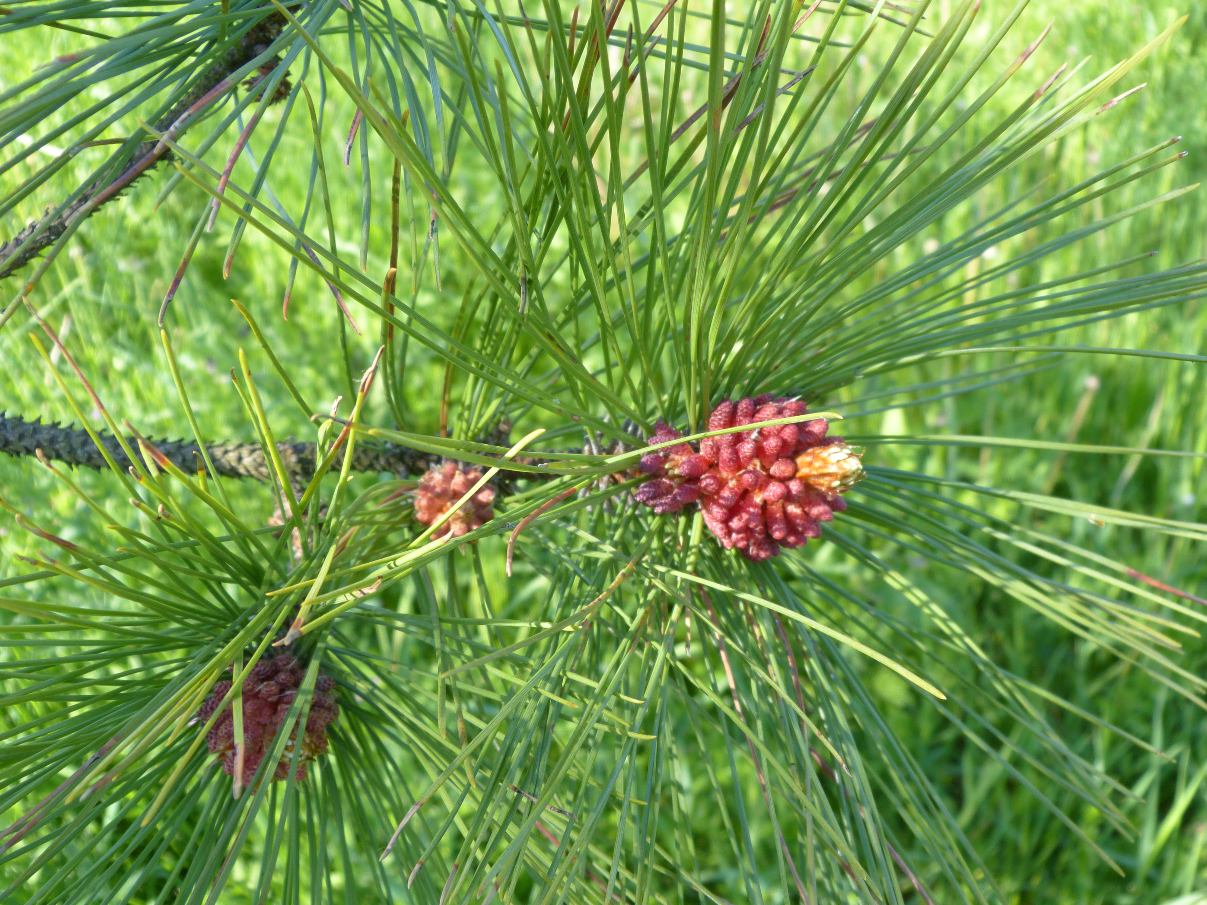 Morfoloģija. Mūžzaļi, dzimtenē 21-24 m augsti koki. Stumbrs slaids, sabiezinātos stādījumos zarojums sākas augstu. Ātri augošs koks. Vainags jauniem kokiem šaurs, vecākiem kokiem platāks, ieapaļš. Miza sarkanbrūna, bieza. Zari atstāvoši vai pārkareni, jaunie dzinumi oranži līdz sarkanbrūni, kaili. Pumpuri šauri koniski, nosmailoti, sveķaini. Skujas kūlīšos pa 2, 10-17 cm garas, 1 mm platas, cieši nosedz dzinumu, tumši zaļas, nosmailotas. Makstis 18-20 mm garas. Čiekuri pa 1 vai 2, simetriski, olveida, atveroties gandrīz apaļi, 4-6 cm gari, 3-4 cm plati, gaiši brūni, nokrīt 3. gadā, dažas apakšējās čiekurzvīņas paliek pie zara. Apofīze nedaudz uzbiezināta, nabiņa strupa, gandrīz melna. Sēklas 3 mm garas, spārns līdz 18 mm garš.