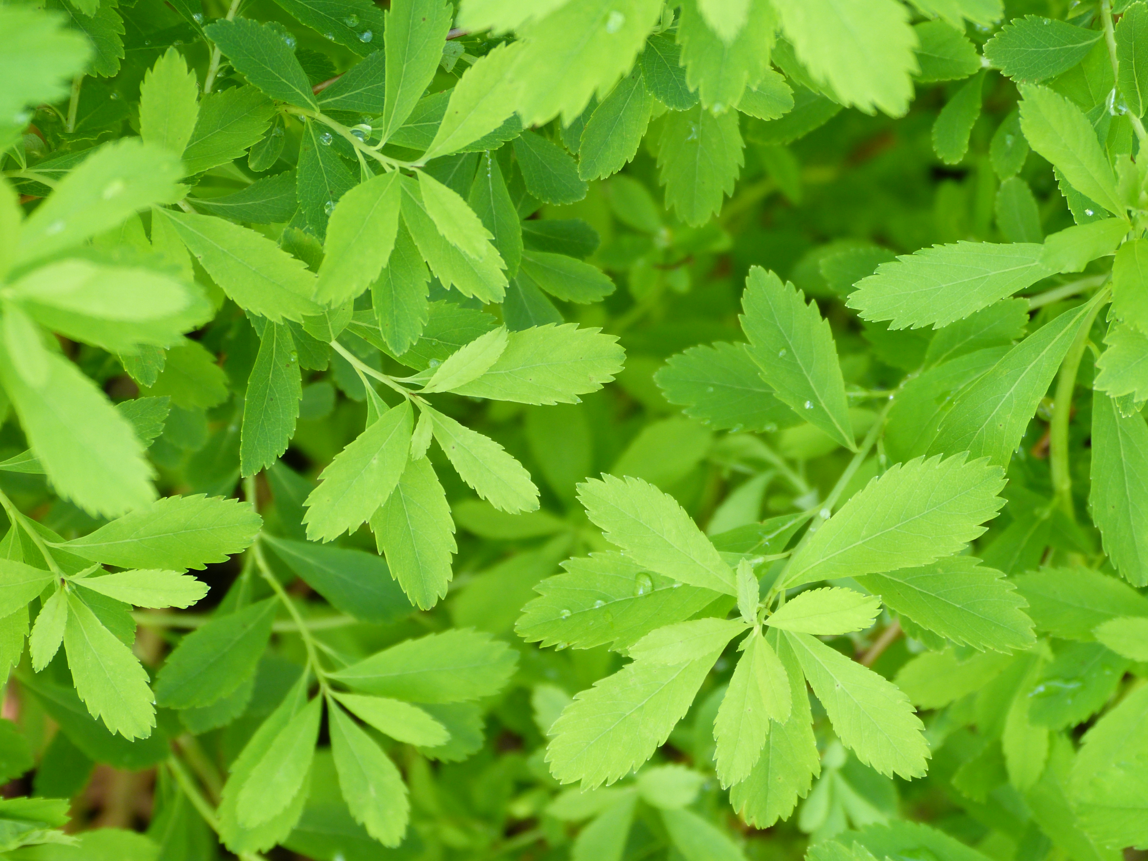 Morfoloģija. 1,5 m augsts krūms. Lapas plati eliptiskas, otrādi olveida līdz iegarenas, ar smailiem galiem, 3-7 cm garas, ar rupji dubultzāģzobainu malu, kailas, rudenī krāsojas zeltaini dzeltenas. Ziedi balti vai bāli rozā, sakārtoti plati piramidālās, līdz 20 cm garās, stāvās vairogveida skarās, zied no VI-VIII.
