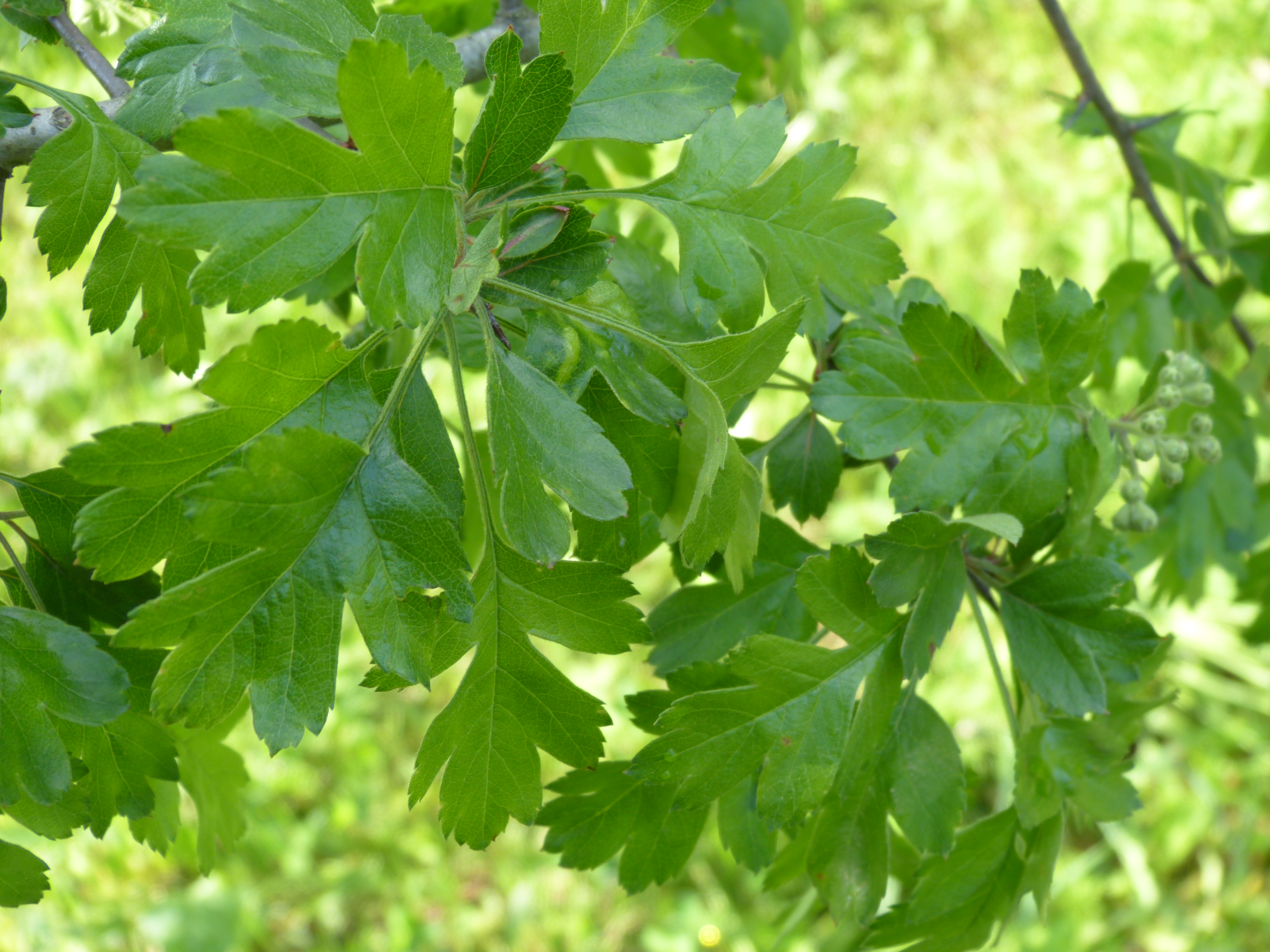 Morfoloģija. Vasarzaļš koks vai krūms, kas savvaļā 2-12 m augsts. Jaunie dzinumi sākumā mataini, vēlāk kaili, brūni. Ērkšķu maz, līdz 1 cm gari. Lapas uz ziedošiem zariem plati olveida, olveida rombiskas vai olveida, 1,5-5,5,cm garas, apakšējās trīsdaivainas, pārējās 5-7 daļīgas, ar plati olveida vai nošķeltu pamatu, biezas, virspusē tumši zaļas, ādainas, nobriedušas gandrīz kailas, apakšpusē uz dzīslām dažkārt matiņi. Ziedkopas daudzziedu, tāpat kā ziedu kātiņi, ziedgultne un kauslapas blīvi matainas. Vainags balts, 10-15 mm plats. Augļi melni vai purpurmelni, ar zilu apsarmi, 0,8-1,0 cm gari, ar stāvām kauslapām. Mīkstums sarkanīgs. Kauliņi 5.