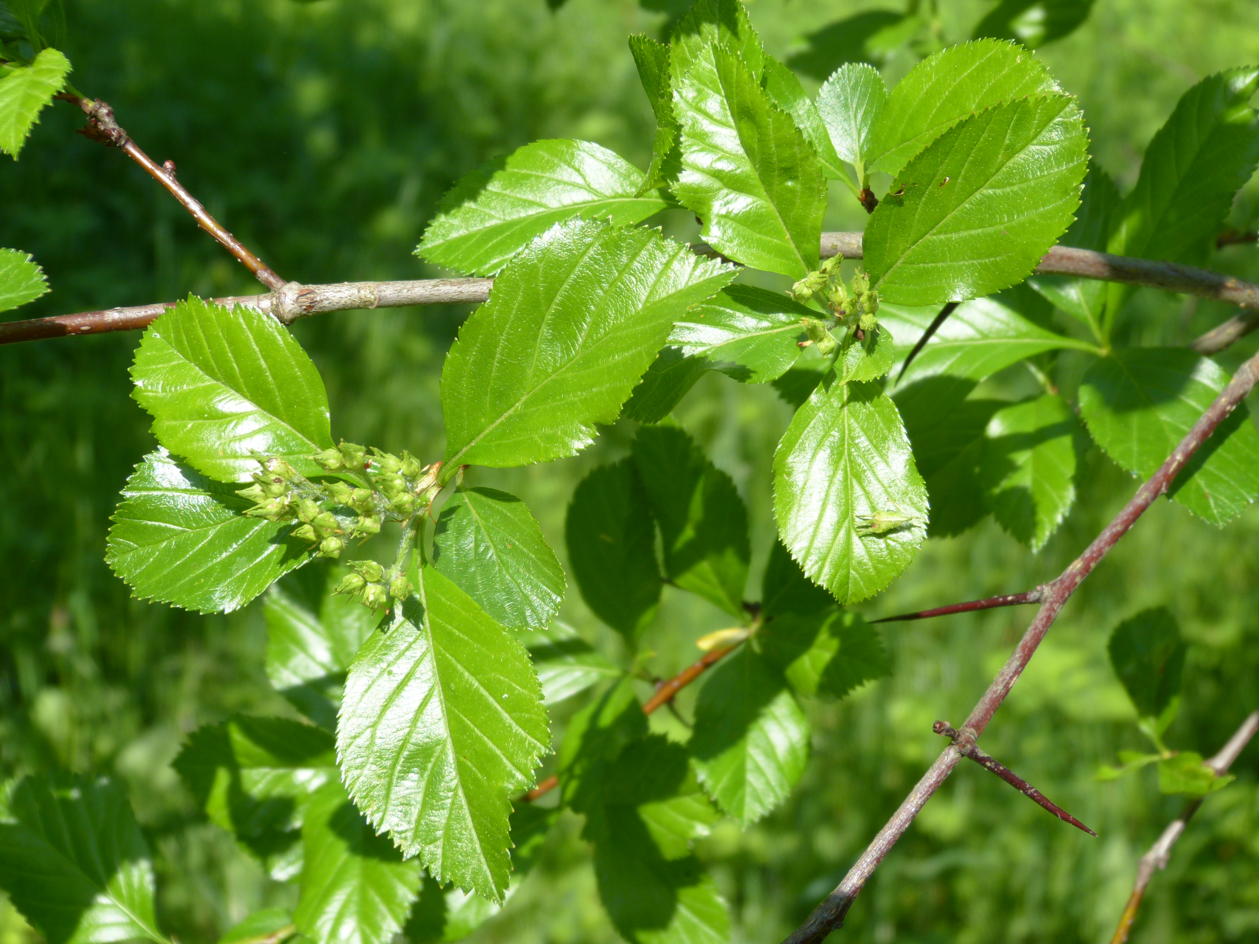Morfoloģija. Vasarzaļš, 3-6 m augsts kociņš vai krūms. Nobriedušie dzinumi kaili, brūni spīdīgi, ar gaišām, garām lenticelēm. Ērkšķu daudz, tie resni, asi, taisni vai viegli izliekti, tumši sarkanbrūni, ar lenticelēm, 2-5 cm gari. Lapas otrādi olveidīgas līdz plati eliptiskas, 3,5-7 cm garas, ar ķīļveida pamatu un vienmērīgi, dziedzeraini zāģzobainām malām. Lapas augšdaļā ar atsevišķiem, asimetriskiem daivveidīgiem zobiem, biezas, ādainas, virspusē tumši zaļas, zaigojošas, nobriedušas gandrīz kailas, ar iegrimušām dzīslām. Ziedkopas daudzziedu un tāpat kā ziedgultne un ziedu kātiņi pūkainas. Kauslapas garas, lineāri lancetiskas, nosmailotas. Vainags balts, 14-18 mm plats. Augļi sarkani, gandrīz apaļi, 0,9-1,2 cm plati, ar izplestām kauslapām. Kauliņi 2-3. Zied jūnijā, augļi nobriest oktobrī un pakāpeniski nokrīt.