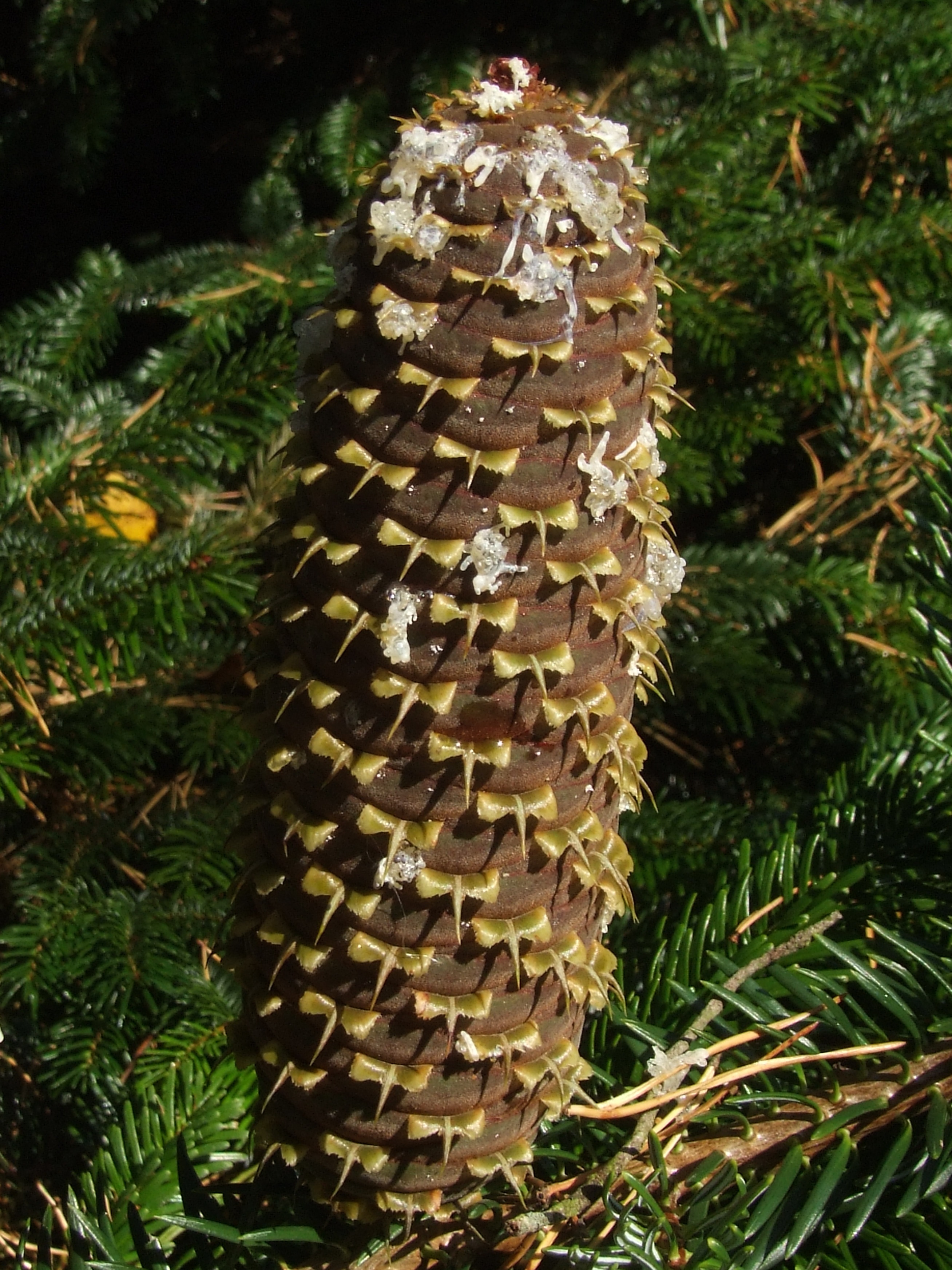 Morfoloģija. Mūžzaļi, dzimtenē 30-40 (50) m augsti koki. Vainags šauri konisks, blīvs. Veciem kokiem apakšējie zari gandrīz pieskaras zemei. Galotne jauniem kokiem smaila, bet vecākiem saplacināta. Jaunu koku miza gluda, pelēka, vecākiem tumši pelēka, dziļi viļņveidīgi saplaisājusi. Pumpuri olveidīgi koniski, nav sveķaini. Skujas uz zariņiem nekārtīgi divās rindās, no augšas nosedz dzinumu, 2-3 cm garas, galā ar jomu vai noapaļotas, virspusē tumši zaļas, spožas, apakšpusē ar 2 baltām atvārsnīšu joslām. Zied maijā. Jaunie čiekuri zaļgani, nobriestot kļūst brūni, 10-16 cm gari, līdz 5 cm plati, gals konisks. Segzvīņas garākas par čiekurzvīņām, ārpusē atliektas. Čiekuri stāvi, nobriest septembrī-oktobrī, vēlāk sairst.
