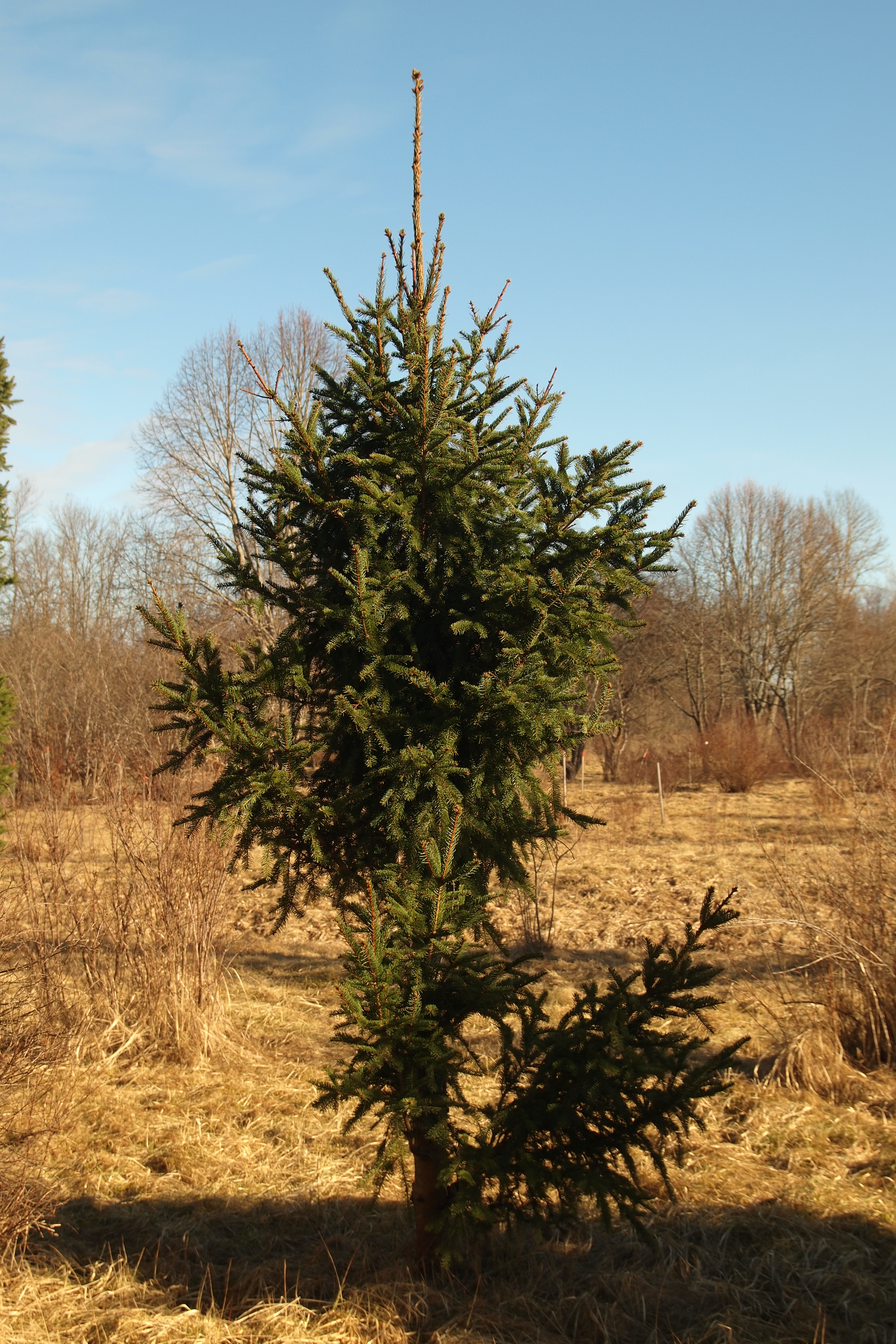 Morfoloģija. Mūžzaļš, normāla augstuma kolonveida koks. Sānzari īsi, horizontāli vai pacili, blīvi sazarojušies. Skujas zaļas.