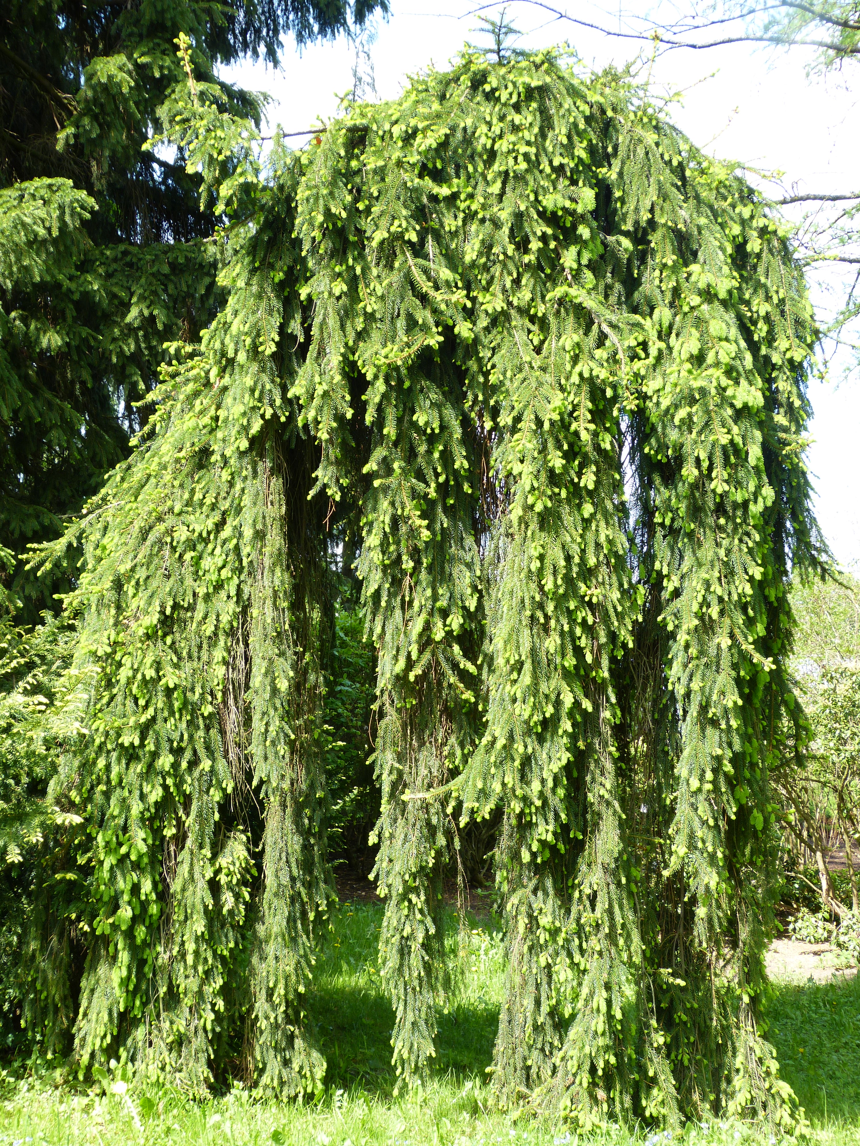 Morfoloģija. Mūžzaļa, vairākus metrus augsta forma ar nokareniem, blīvi stumbram piegulošiem zariem, kas sasniedz zemi un gulstas uz tās. Pumpuri brūni, ziemā sveķaini, lieli. Gala pumpuri 5-6 mm gari, blakus pumpuri 3-4 mm. Skujas novietotas radiāli, koši zaļas, 8-12 mm garas, spīdīgas. Aberatīvās skujas garas, uzkrītošas, veidojas arī pie gala pumpuriem.