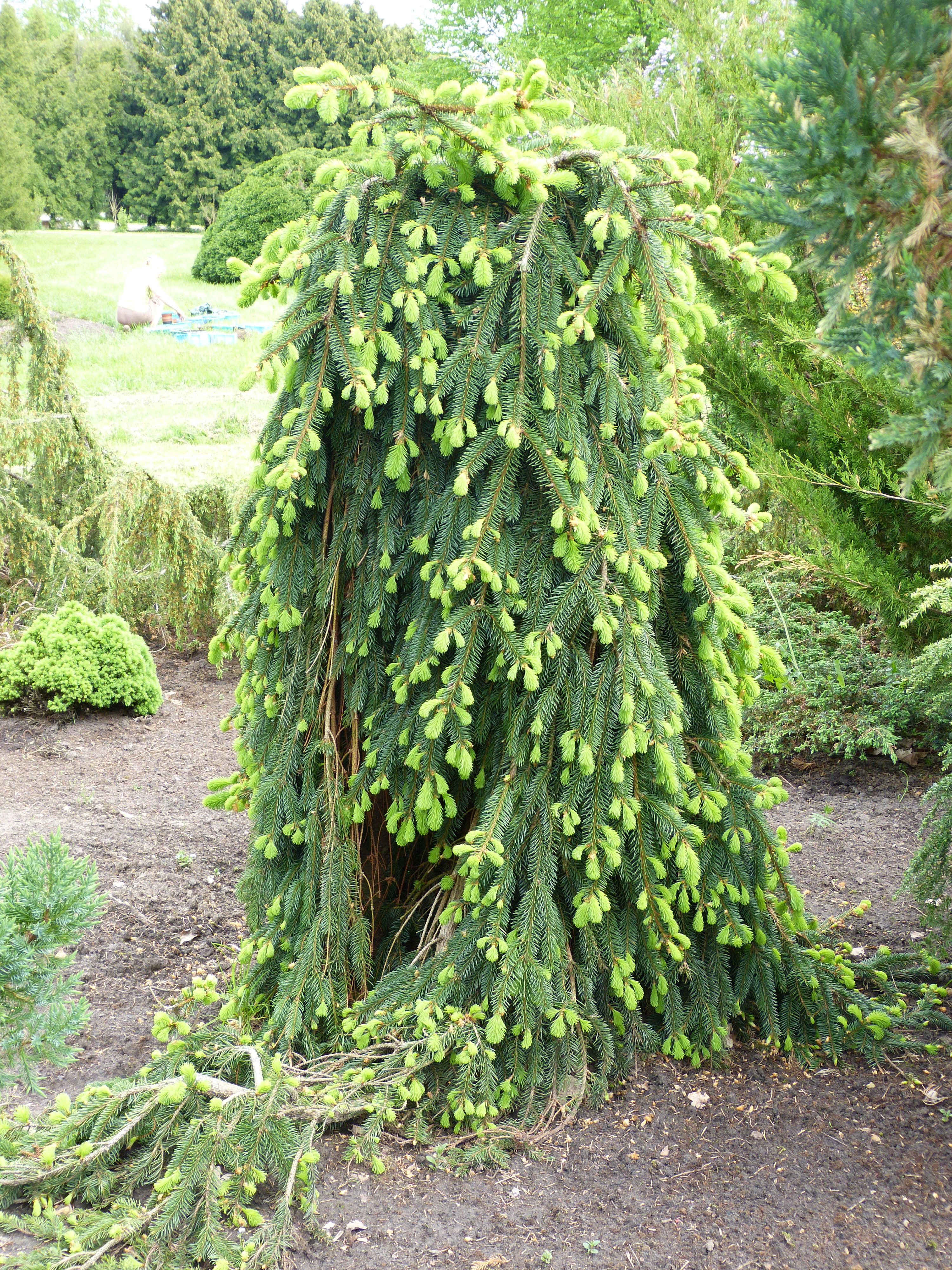 Morfoloģija. Mūžzaļa nokarena forma - vairākus m augsts koks ar nevienādiem nokareniem zariem. Lielākais koks sasniedzi 10 m augstumu, 5 m platumu. Skaista, kā visas līdzīgās nokarenās formas. Latvijā stādīta reti.