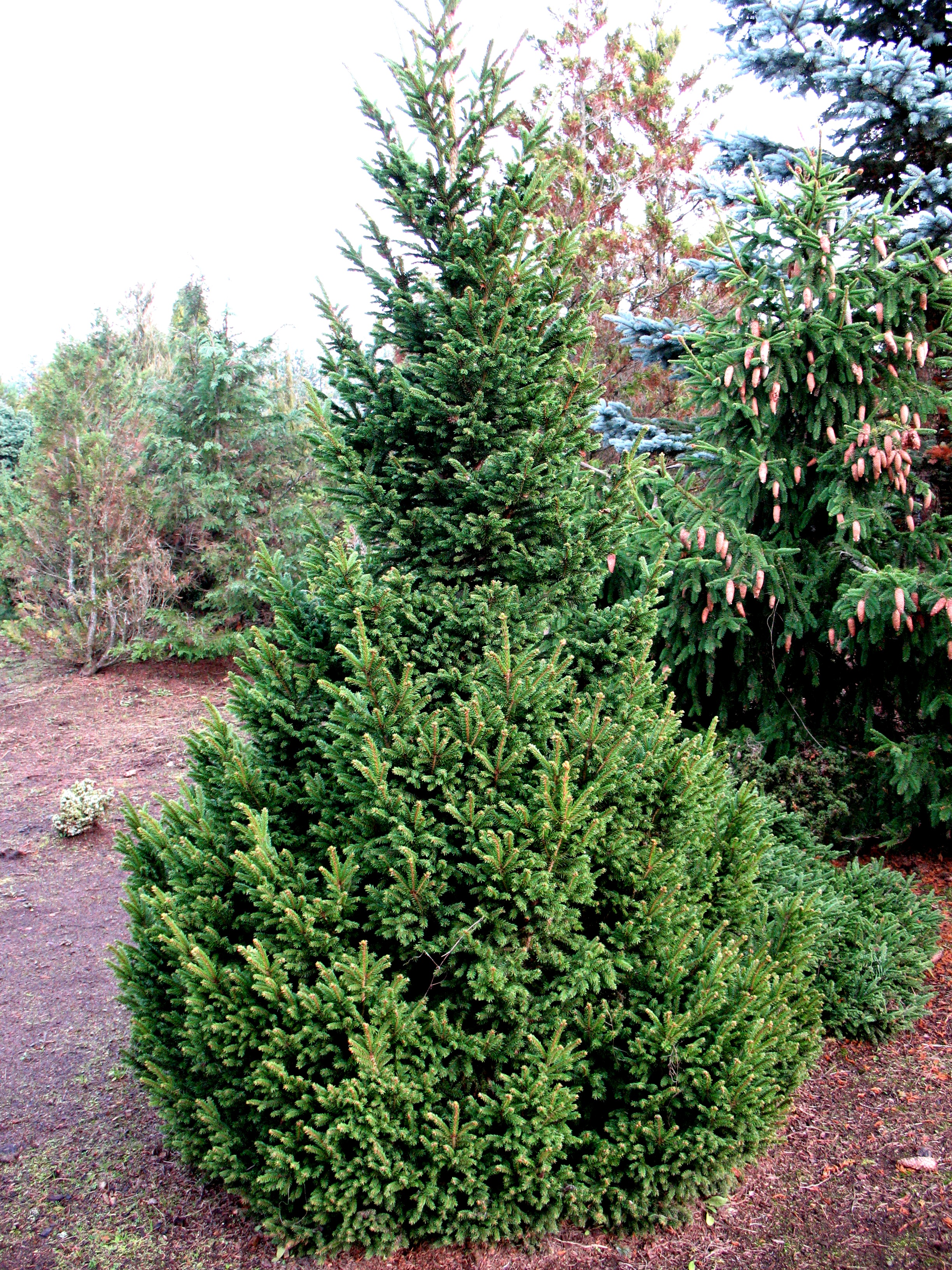 Morfoloģija. Mūžzaļa, plata, koniska, blīva, smalki sazarojusies forma. Dzinumi bāli dzelteni līdz brūngani, mataini. Pumpuri lieli, olveidīgi koniski, gaiši brūni, bez sveķu pārklāja. Gala pumpuri 4-8 mm gari, ar1-2 blakus pumpuriem, sānpumpuri 3-5 mm gari. Skujas uz zariņiem skrajas, koši zaļas, sirpjveidīgi sagriezušās vai taisnas, spīdīgas, 8-12 mm garas, uz vadošajiem dzinumiem izvietojas radiāli, vērstas dzinuma gala virzienā, bet spēcīgo sānzariņu skujas pusradiāli, zem dzinuma veido celiņu. Aberatīvās skujas garas, novietotas 70-90º leņķī. 25 gadu laikā sasniedz 2,5 m augstumu.