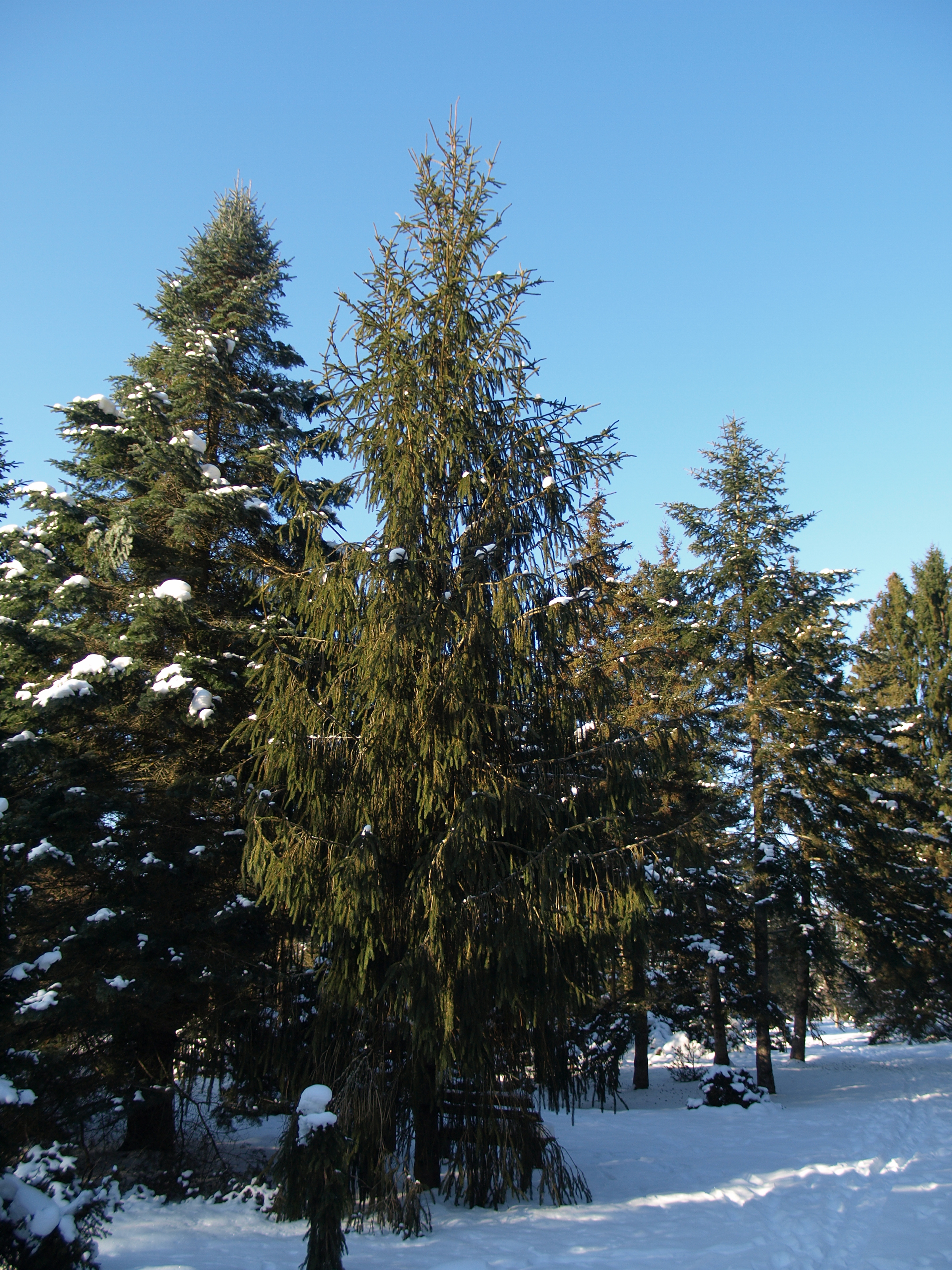 Morfoloģija. Mūžzaļš, līdz 20 m augsts koks ar plati piramidālu vainagu, gariem horizontāli atstāvošiem, vēlāk ieslīpi uz leju atliektiem zariem un ķemmveidīgi nokareniem dzinumiem. Skujas 2,5-3 cm garas, gaiši zaļas, nedaudz sirpjveidīgi izliektas.