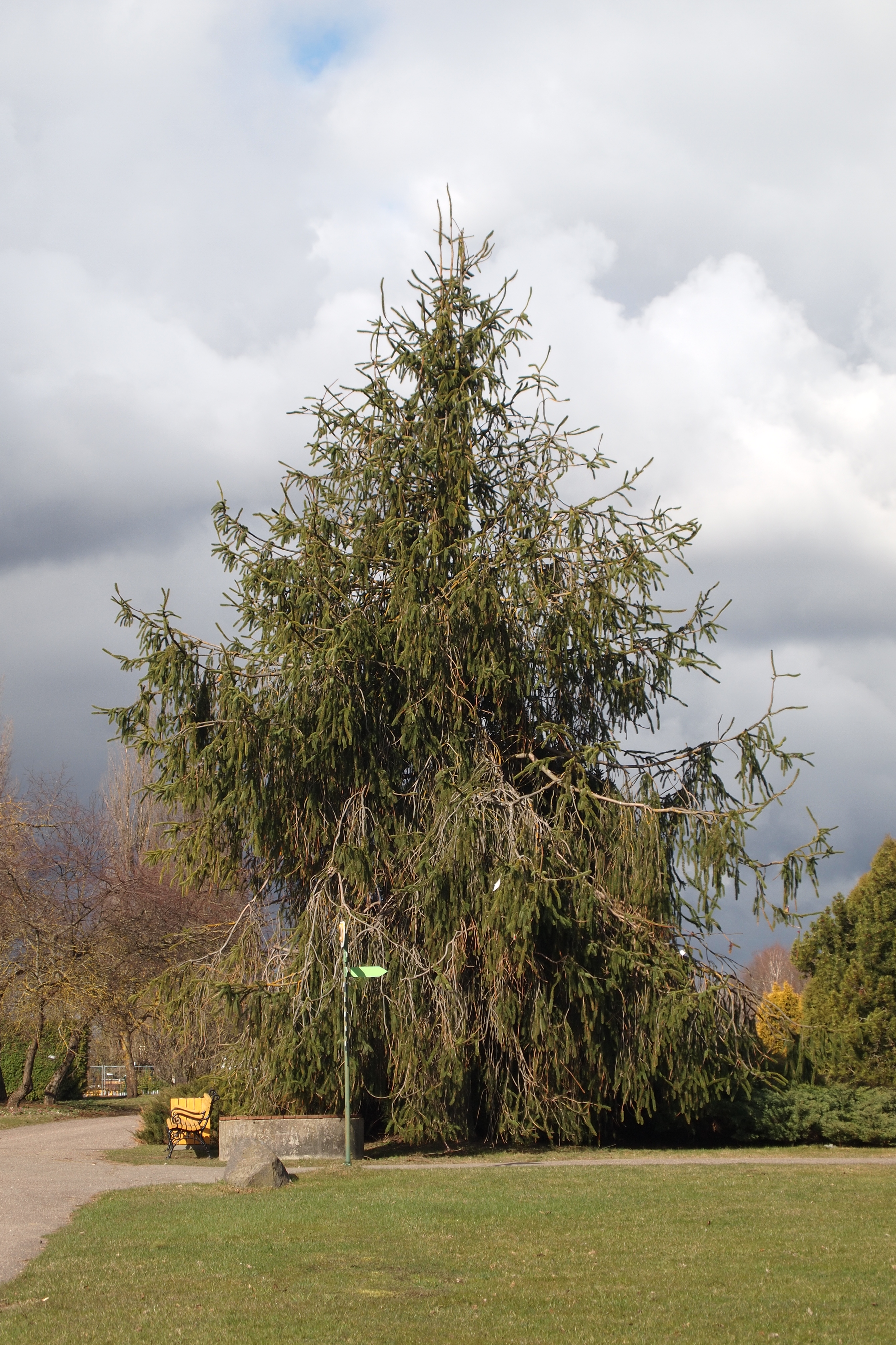Morfoloģija. Mūžzaļš augsts koks vai krūms, kas saglabā vadošo stumbru. Sānzari tikpat kā nezarojas, izliekušies vai atliekušies, vai neregulāros mieturos, reizēm samudžināti, augšējie zari vērsti uz augšu, apakšējie vairāk nokareni, bieži dzinumam tikai galotnes pumpurs, tādēļ tas aug tikai garumā un nezarojas. Gada pieaugums līdz 1 m. Skujas uz dzinuma novietotas radiāli, dažāda garuma (līdz 3 cm), atstāvošas vai piespiestas, izliekušās.
