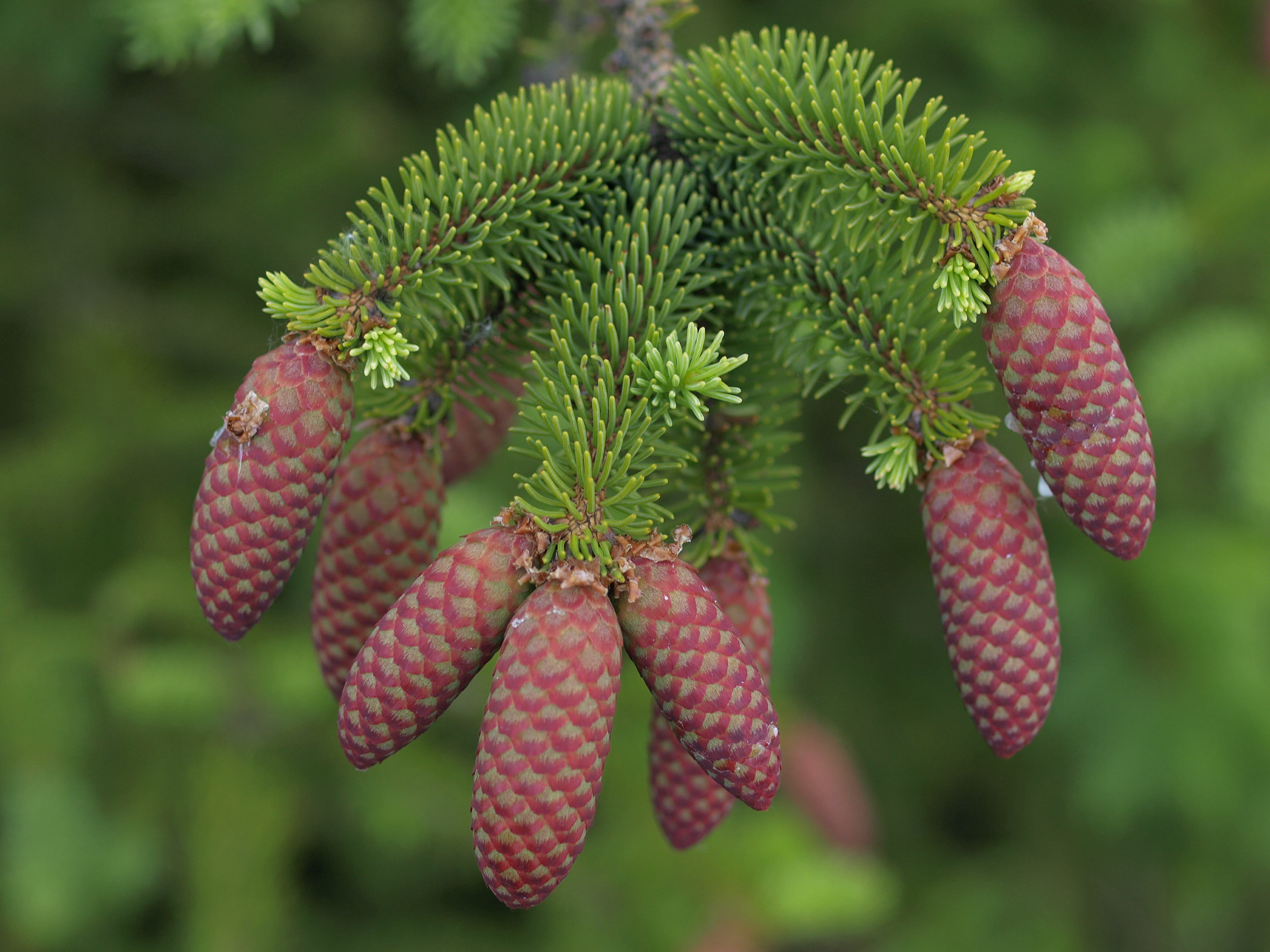 Morfoloģija. Mūžzaļi, dzimtenē 30-45 m augsti koki. Vainags šauri konisks, blīvs. Miza sarkanbrūna, lobās šaurās plēksnēs. Zari tievi, īsi, dzinumi sarkanbrūni (!), klāti ar bieziem rūsganiem matiņiem. Pumpuri olveida līdz koniski, sveķaini. Skujas no virspuses cieši pārklāj zariņu, īsas, 6-10 mm garas, virspusē tumši zaļas, apakšpusē bāli zaļas, nedaudz saplacinātas, strupas, jauniem kokiem biežāk smailas. Čiekuri iegareni cilindriski līdz olveida cilindriski, galos noapaļoti, 4-8 cm gari, negatavi purpurīgi zaļi līdz tumši violeti, nobrieduši spīdīgi brūni, čiekurzvīņas ieapaļas, parasti ar gludu vai nedaudz zobainu malu.