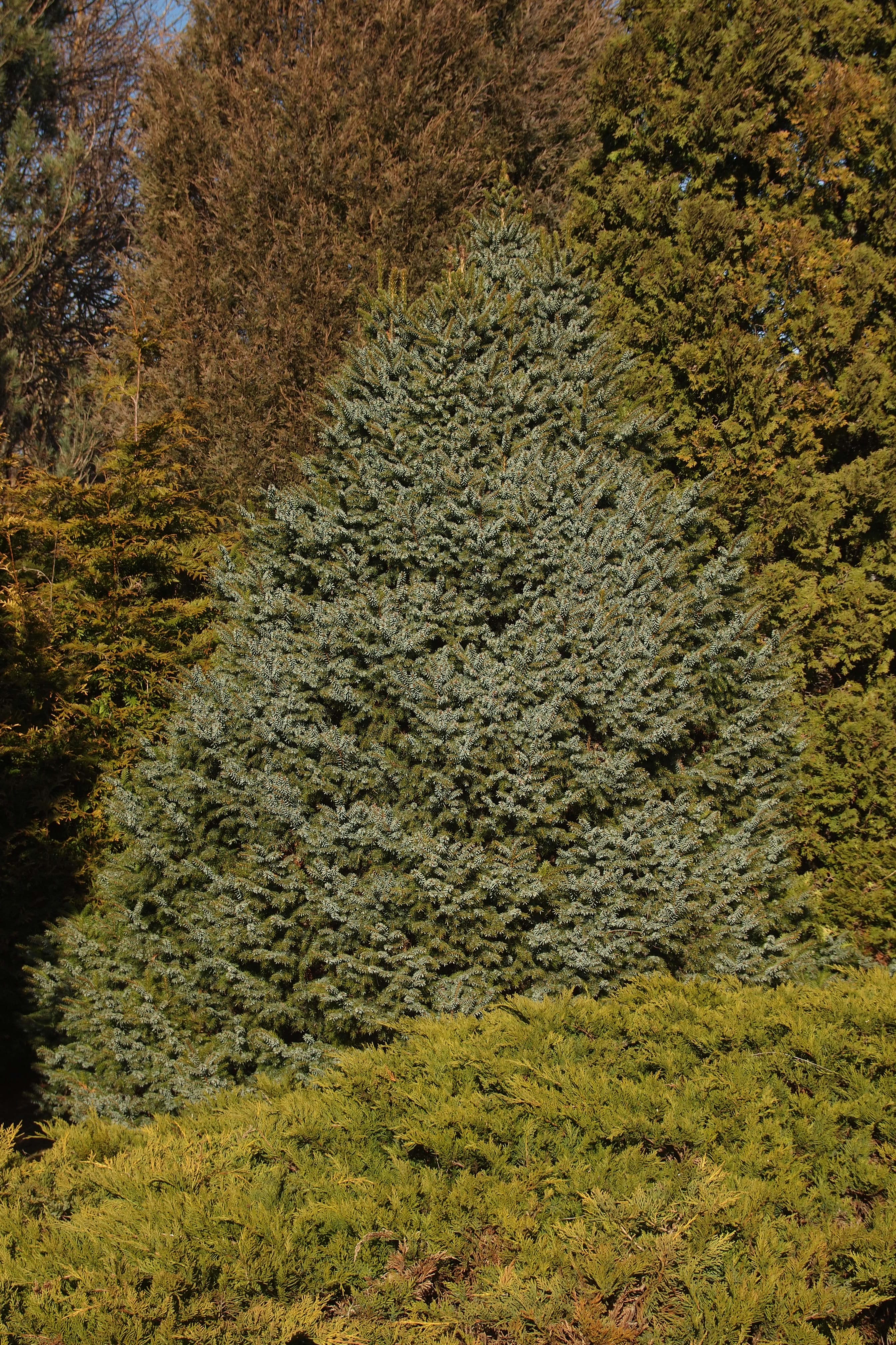 Morfoloģija. Mūžzaļa, ieapaļa, plakani koniska pundurforma, taču vecāki augi var sasniegt līdz 3 m augstumu. Var veidot lēni augošu galotni. Ļoti blīvi sazarojusies, taču zarojums nevienmērīgs. Gada pieaugums 2-6 cm. Skujas tumši dzeltenzaļas līdz sudrabainas, apakšpusē ar 2 baltām atvārsnīšu joslām. 10 gados izaug 75x60 cm.