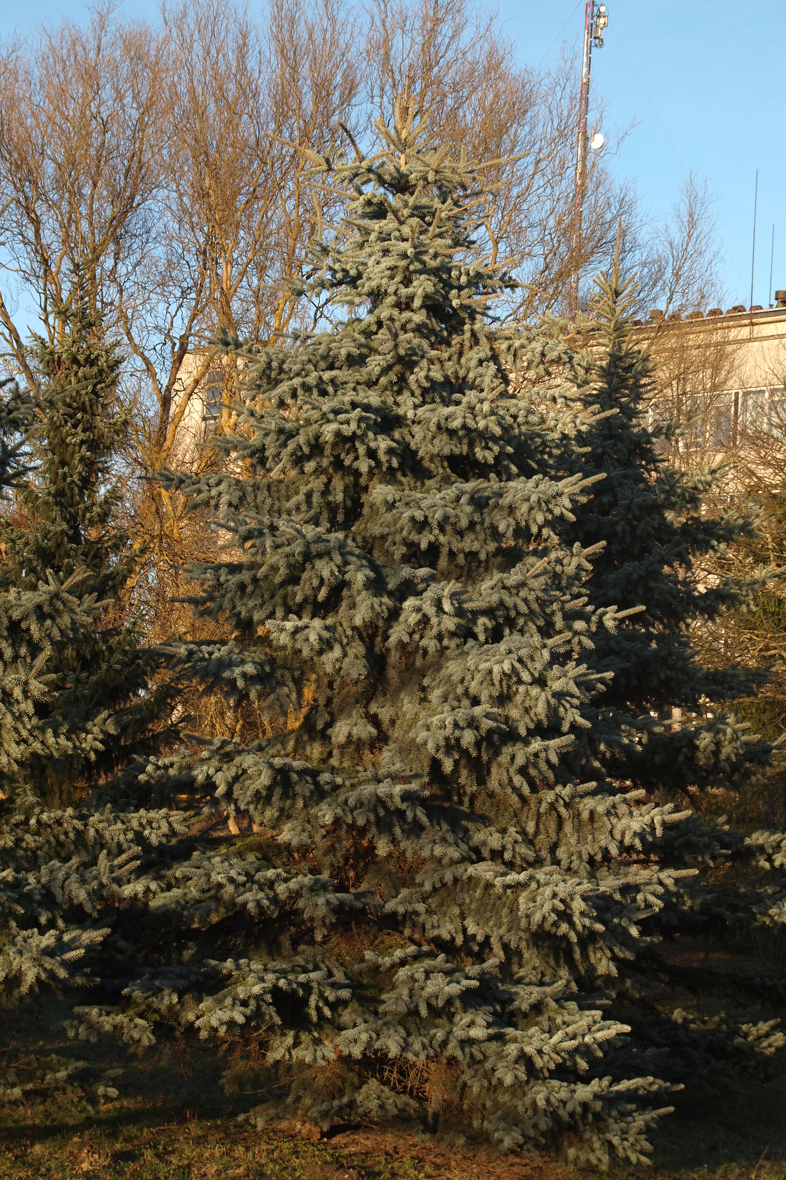 Morfoloģija. Mūžzaļš koks ar šauri konisku, neregulāru augumu un gariem vadošajiem zariem un piegulošākām nekā pamatsugai, zilganām skujām. Sānzari īsi, horizontāli atstāvoši, mieturos, jaunie dzinumi dzeltenbrūni. Gala pumpuri ļoti lieli, dzeltenbrūni, 10-15 mm gari, sānu pumpuri neregulāri, gandrīz spirāliski novietojušies zem gala pumpura. Zvīņas galā atliekušās. Skujas 25-30 mm garas, sudrabpelēkas ar zilganbaltu apsarmi, saglabā zilgano toni arī ziemā un vēl nākamajā gadā.