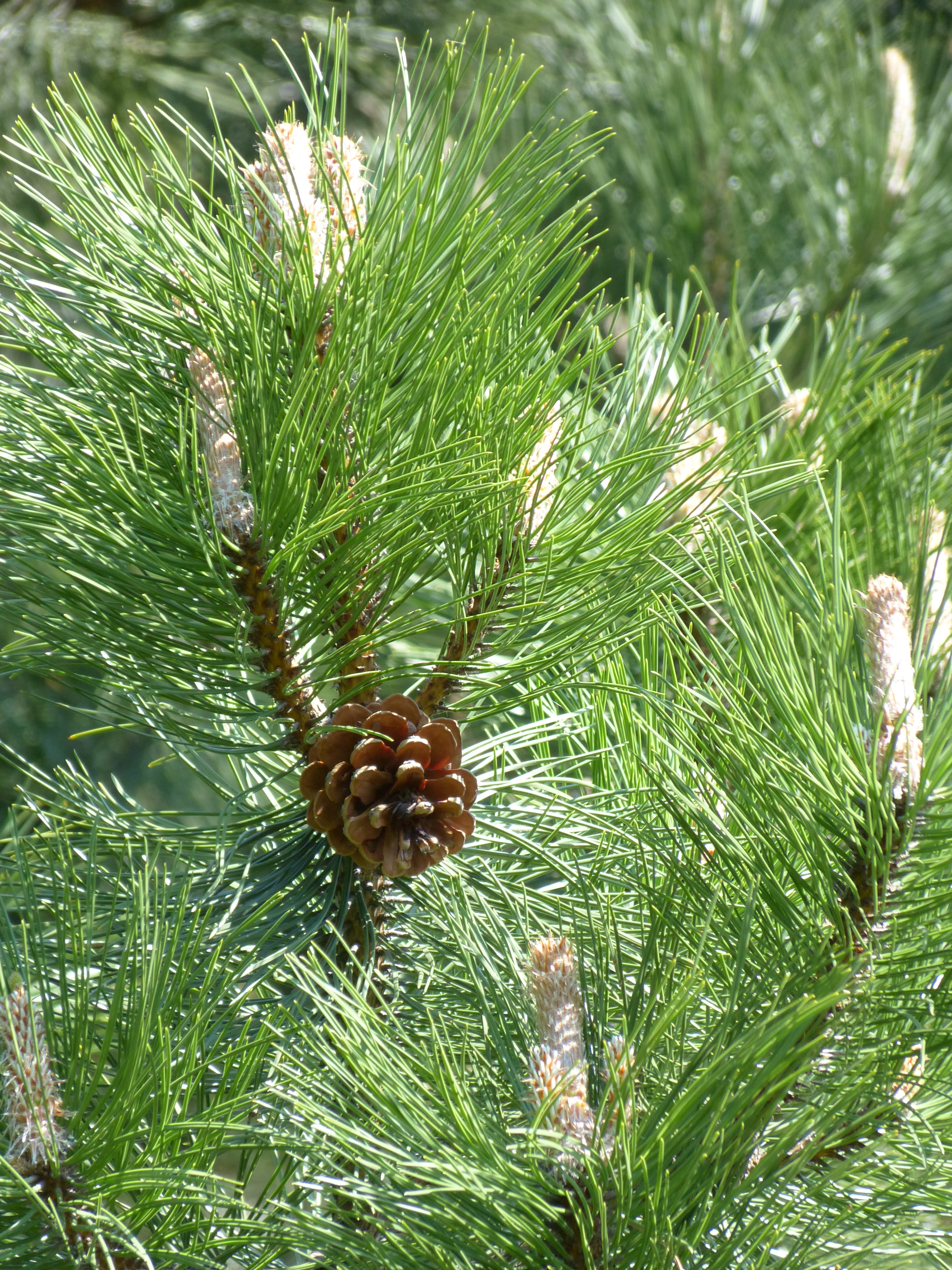 Morfoloģija. Mūžzaļi, 20-30 m augsti koki ar jaunībā konisku, vēlāk plakanu vainagu. Mizu veido dziļi saplaisājušas tumši brūnas zvīņmizas plātnes. Zari plati izplesti, nereti ar paciliem galiem. Viengadīgie dzinumi kaili. Pumpuri pie pamata plati olveida, ar krasi nosmailotu galu, ar spīdošu sveķu pārklāju. Skujas 8-12 cm garas, tumši zaļas, cietas, durstīgas, taisnas vai izliekušās, skuju makstis 10-16 mm garas. Zied jūnija sākumā. Čiekuri olveidīgi koniski, nobriest nākošā gada rudenī, dzeltenbrūni, spīdīgi, apofīzes olveida, vāji izliektas, ar šķērsķīli, nabiņa sīka, galā ar ērķšķīti. Ienākas septembrī-oktobrī, izbirst nākamā gada aprilī-maijā.