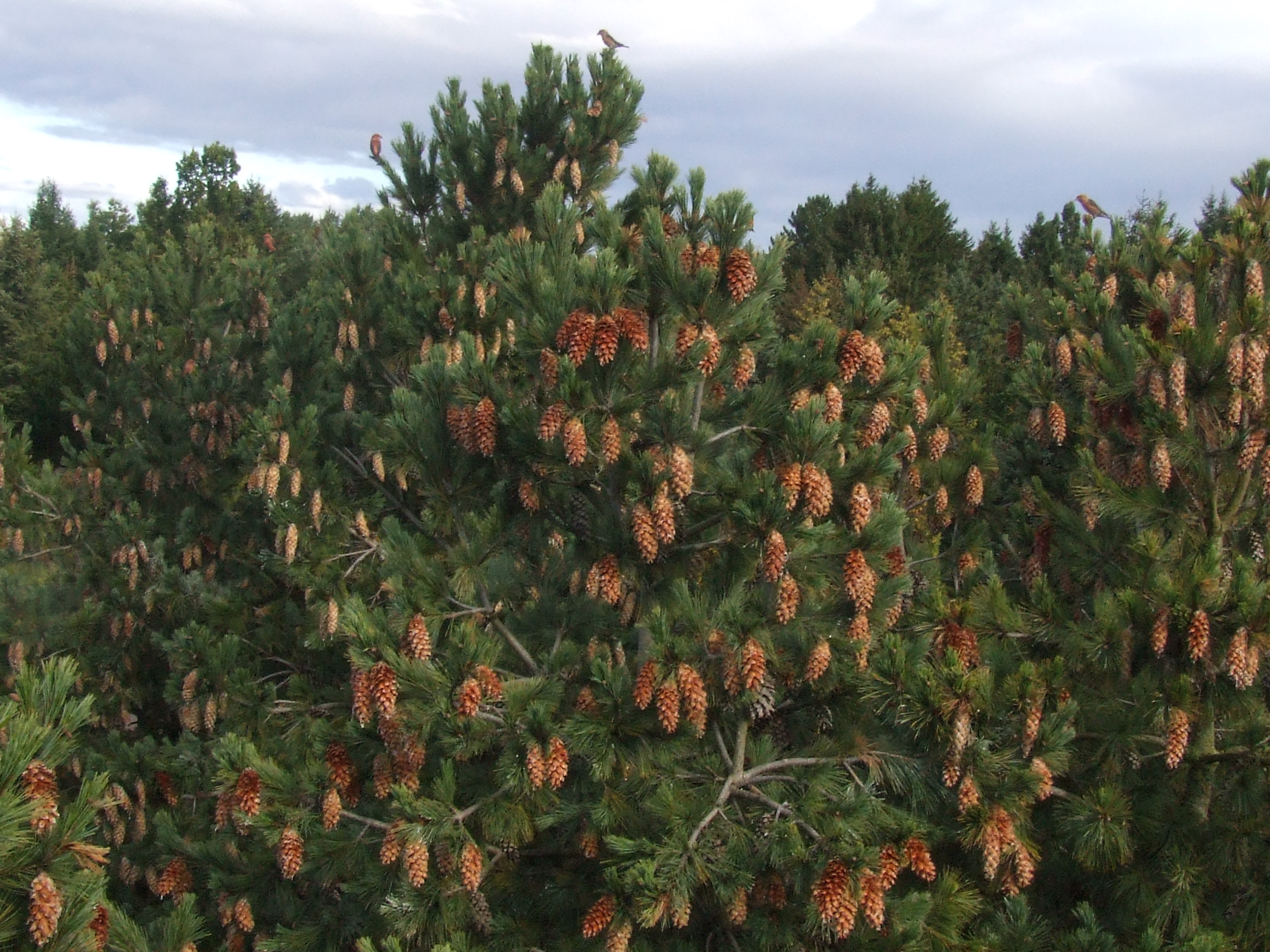 Morfoloģija. Mūžzaļi, šauri koniski, 20-25 m augsti koki. Zari stāvi, blīvi. Miza jauniem kokiem gluda, pelēka, vēlāk saplaisā un iekrāsojas purpurīgi brūnā tonī. Jaunie dzinumi resni, kaili, spīdīgi, sākumā zaļi vai gaiši pelēcīgi brūni. Pumpuri 9-10 mm gari, gaiši brūngani, sveķaini. Skujas kūlīšos pa 5, blīvi sakļāvušās, vērstas dzinuma gala virzienā, 7-12 mm garas, zilganzaļas, stīvas, taisnas. Zied maijā. Čiekuri cilindriski, pa 1-4, uz īsiem kātiem, 8-15 cm gari, 2,5-3 cm plati, sveķaini, gaiši brūni. Čiekurzvīņas izliektas, nobriest septembra sākumā, strauji atveras, izbirst īsā laikā. Gandrīz katru gadu ražo čiekurus ar dīgtspējīgām sēklām.