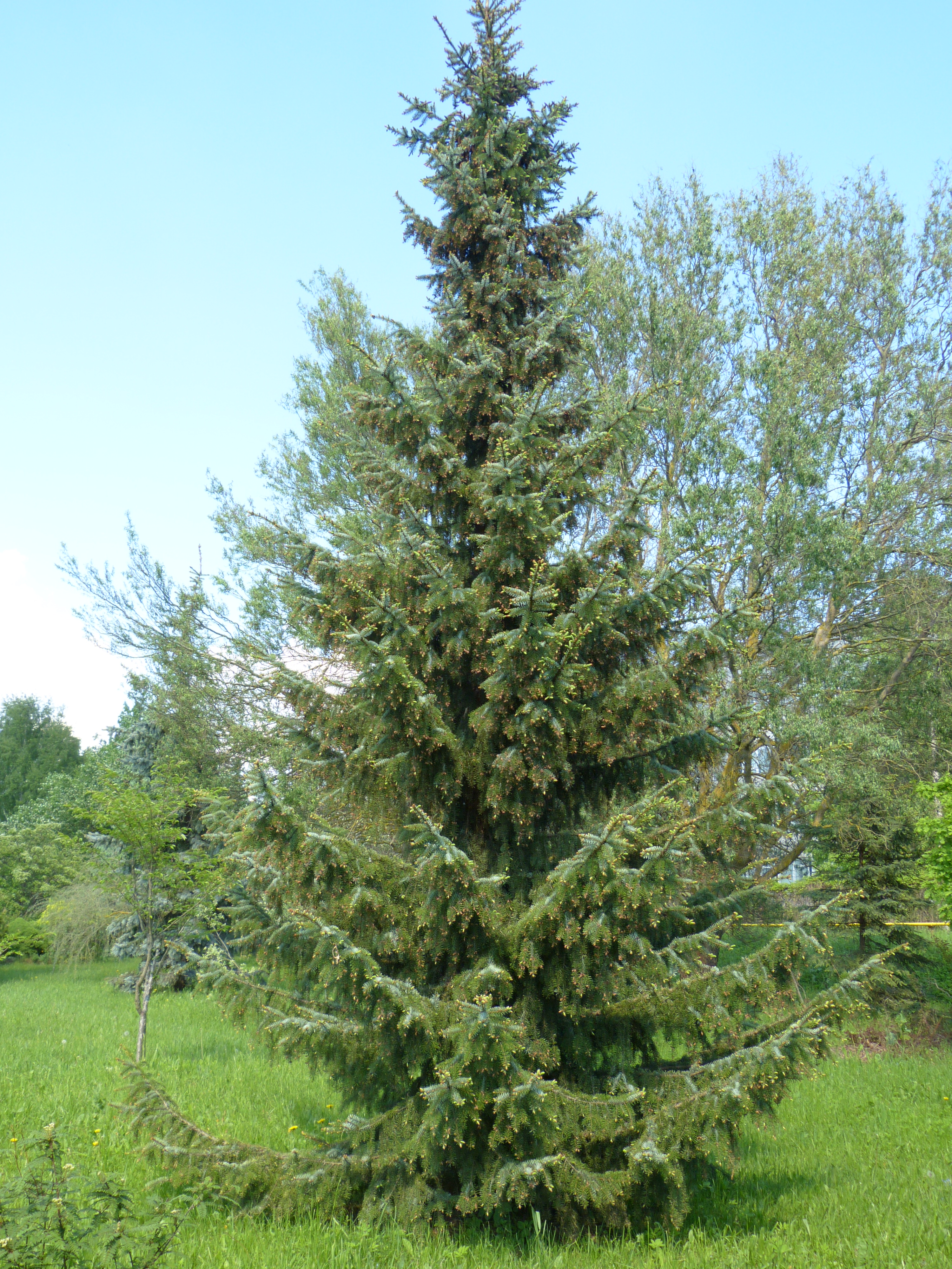 Morfoloģija. Mūžzaļš stāvs koks, zari nokareni. Reizēm liecas arī stumbrs, tad vadošais dzinums jāpiesien. Skujas virspusē tumši zaļas, spīdīgas, apakšpusē zilganbaltas ar 2 atvārsnīšu joslām.